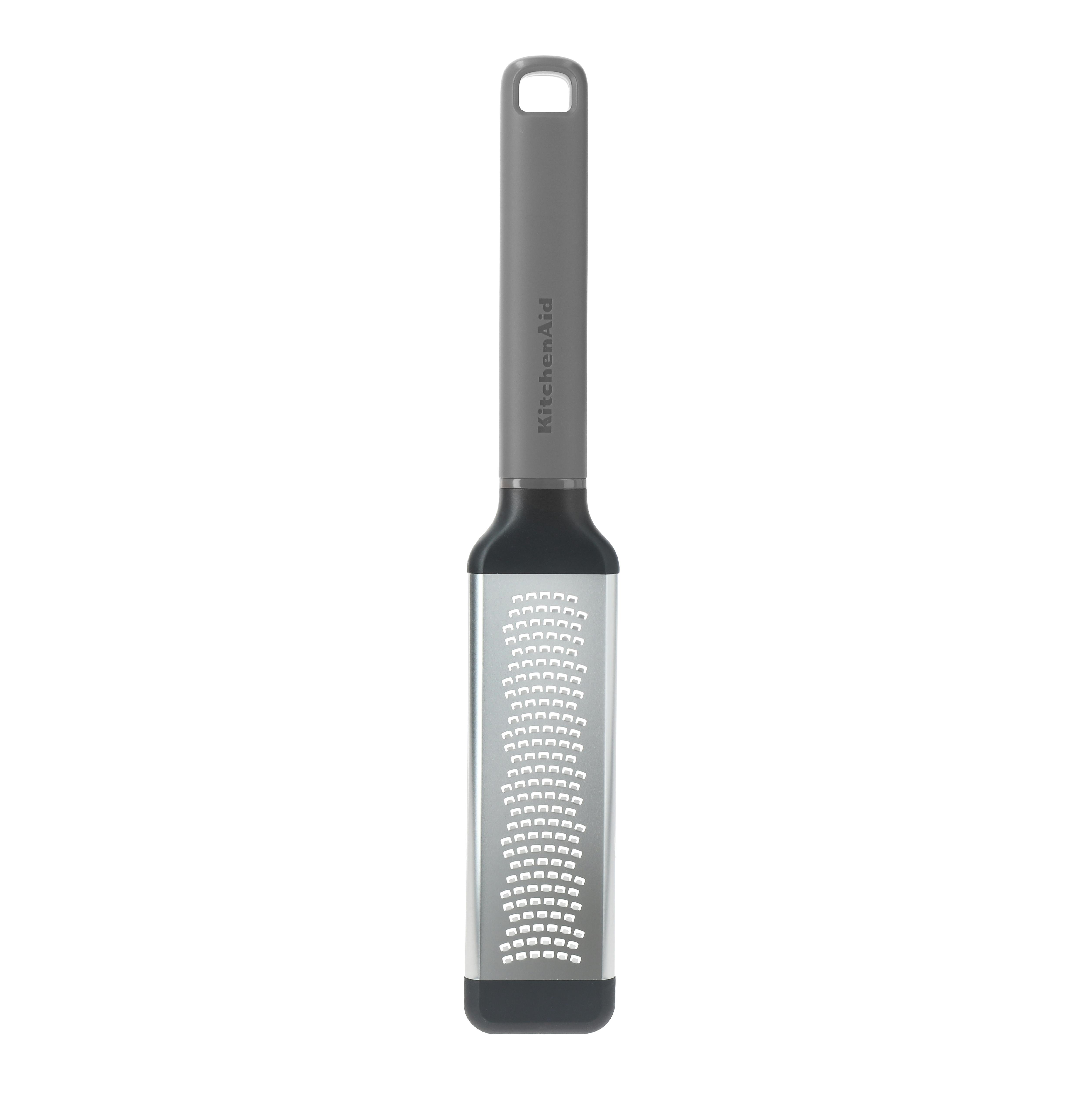 From KitchenAid, the Fine Grater in charcoal grey brings a considered, premium feel to everyday prep, with an ergonomic handle that’s precisely weighted for comfort, balance and control. Designed to s more→it confidently in the hand, it’s finished with a debossed logo and a built-in hanging loop for convenient storage. The stainless steel grater head features micro-serrations that grate in both directions for faster, efficient results. It’s well suited to fine grating tasks such as ginger and nutmeg, as well as zesting lemons, limes and other fruits. For added stability while you work, a cushioned non-slip foot helps keep the grater steady when used directly into bowls, onto cutting boards or over f…