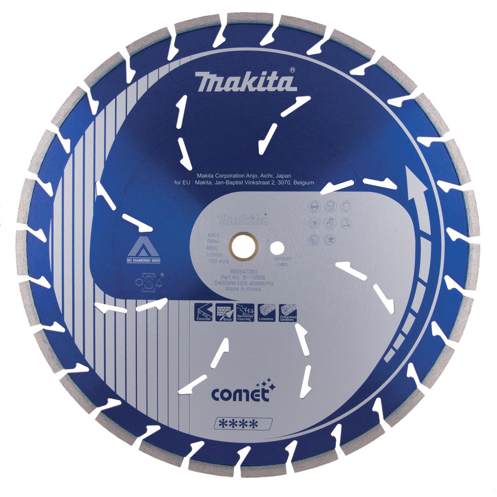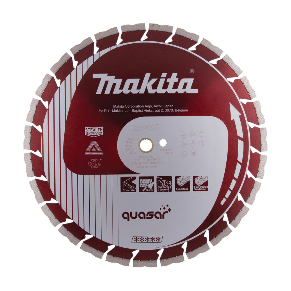 The Makita Quasar Stealth Diamond Wheel is a high-performance segmented blade designed for dry and wet cutting of tough materials like stone, concrete, and masonry. Engineered with advanced 3D Diamond more→Grid (3DDG) technology, it ensures even diamond distribution across the blade, resulting in consistent, accurate cutting and enhanced overall efficiency. Built for demanding tasks, the Quasar Stealth features a triple-layered core that minimises vibration and reduces noise, offering a smoother, more comfortable cutting experience. The blade is equipped with laser-welded M-shaped segments, providing exceptional cutting life and effective debris clearance even under heavy load. Features and Benefits …
