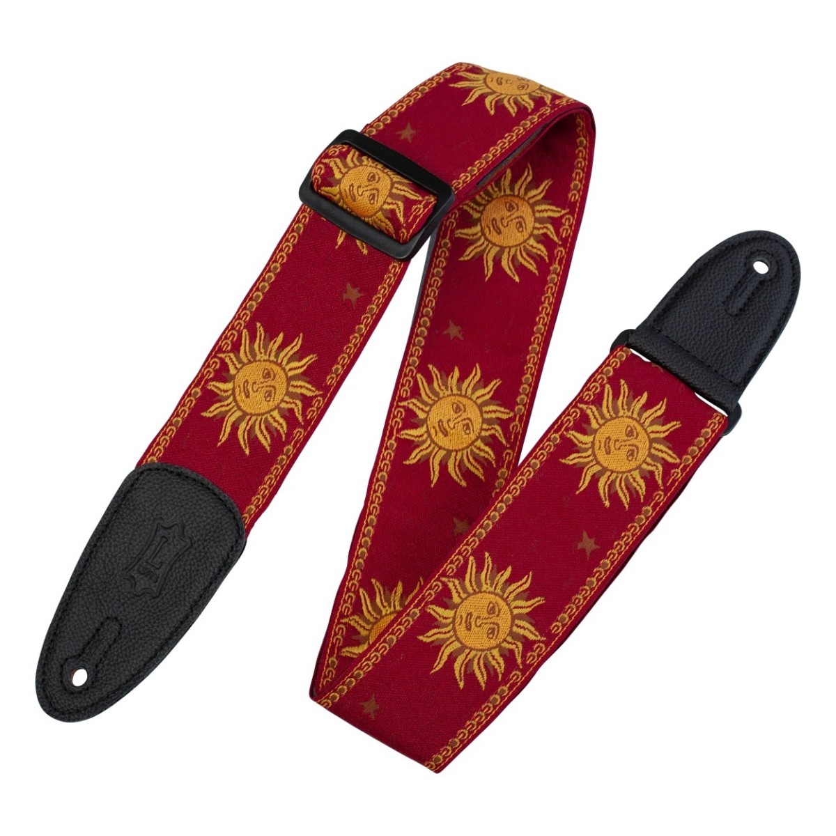 The Levys Jacquard Weave W Leather Back & Ends 2 Sun Design Strap is designed for guitarists who want reliable comfort with distinctive visual detail on stage or at home. The 2" woven strap features a more→detailed yellow-on-red sun motif that adds character without feeling over the top making it a solid choice for regular rehearsals gigs or studio use. Adjustment is simple thanks to the tri-glide sliding system letting you fine-tune the length up to 57" for your preferred playing position. The garment leather backing sits comfortably on the shoulder and helps keep the strap in place even during longer sets. Genuine leather ends with reinforced pin hole stitching reduce stretching and wear so your …