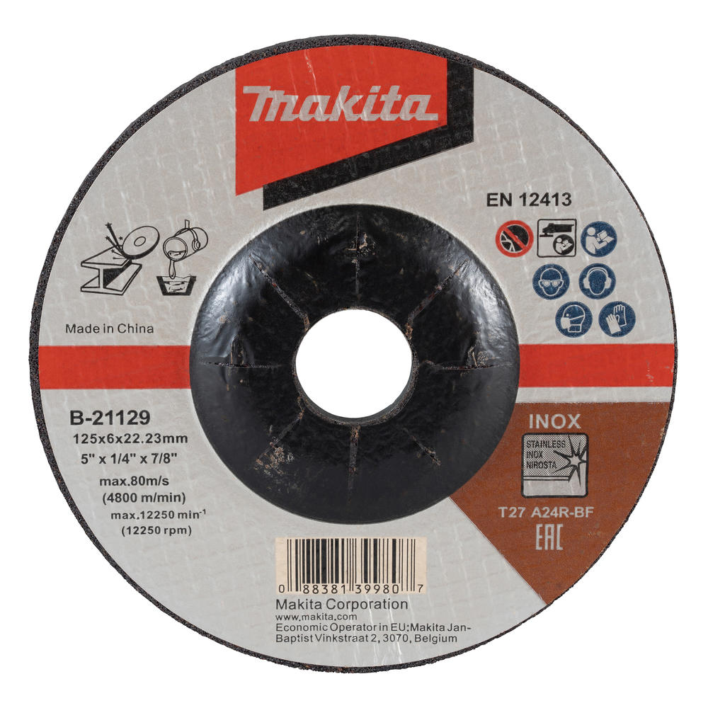 Heavy duty depressed centre grinding disc. Specifications • Grit: A24R-BF • Bore: 22.23 mm • Diameter: 125 mm • Thickness: 6 mm • Pack Quantity: 1