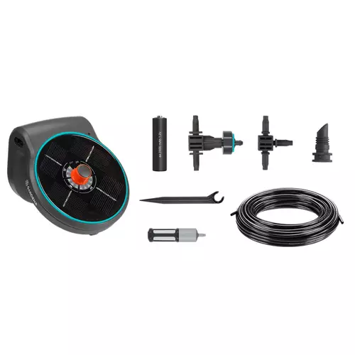 Plant care for when youre not there. With GARDENA AquaBloom your balcony and tub plants are in good hands - all season long. AquaBloom w more→aters and takes care of your plants even in times when you're not around. The helpful system requires neither a water tap nor a power supply in your garden or terrace. With just an additional water bucket youll be ready to go. The AquaBloom set is a complete ready-to-use irrigation system consisting of a 3-in-1-main unit. It combines a pump to draw water a control unit to define the irrigation schedule and a solar panel that feeds the included rechargeable batteries. The 14 pre-defined watering programs >…