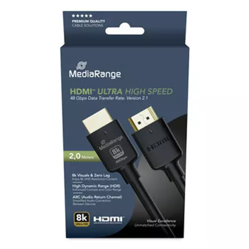 MediaRange HDMI Ultra High Speed Ethernet Cables are engineered to deliver stunning visuals and seamless connectivity for your audio-visual experience whether for entertainment gaming or professional more→presentations. Our wide range of dependable high quality cables guarantees a reliable and efficient connectivity solution for various applications. With data transfer rate of up to 48 Gbps this cable is designed to meet the demands of modern digital devices.