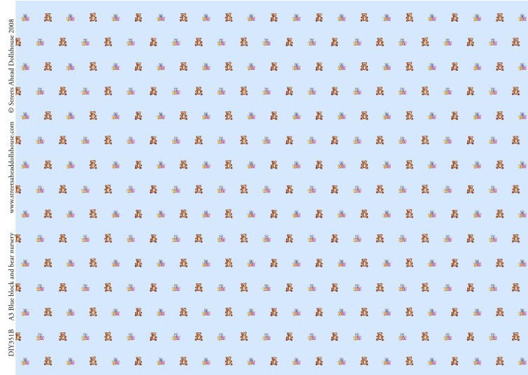 Block and Bear Blue Nursery Wallpaper 297mm x 420mm for 1/12 Scale Dolls Housefrom £1.00Compare prices2→1/12th Scale Block and Bear Dolls House Nursery Wallpaper. A super way to complete your nursery. Size: 297mm x 420mm