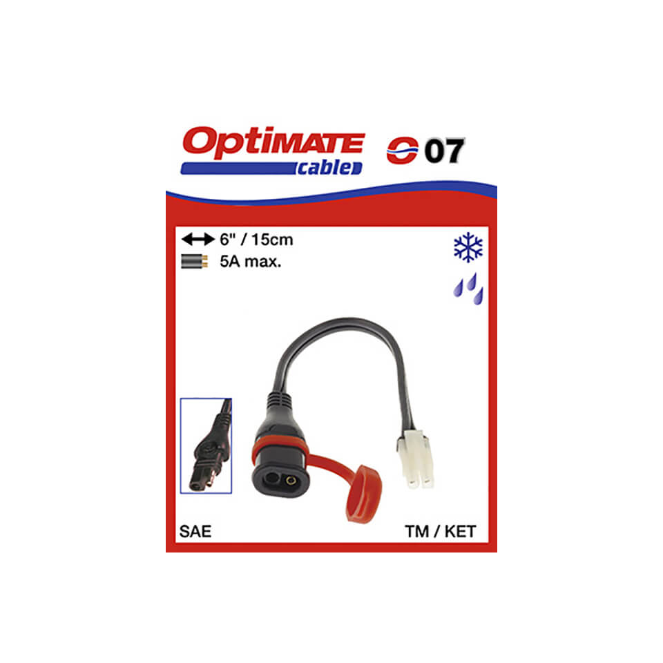 OptiMate O17OptiMATE cable O-17. Convert your older TecMate charger or British chargers to connect to the OptiMATE permanent battery cable (or other SAE battery cable). The 2-pin KET / TM / british connector is converted to an industry standard SAE 2-pin connector. Features Length: 15 cm Max. cable load: 5 A Use at very low temperatures: down to -40 ° C High quality cable, developed by TecMatePrice from £8.55 up to £9.75 Compare prices and buy OptiMate O17 Motoin.de →£9.00Fc-moto.de →£10.00Compare prices2→