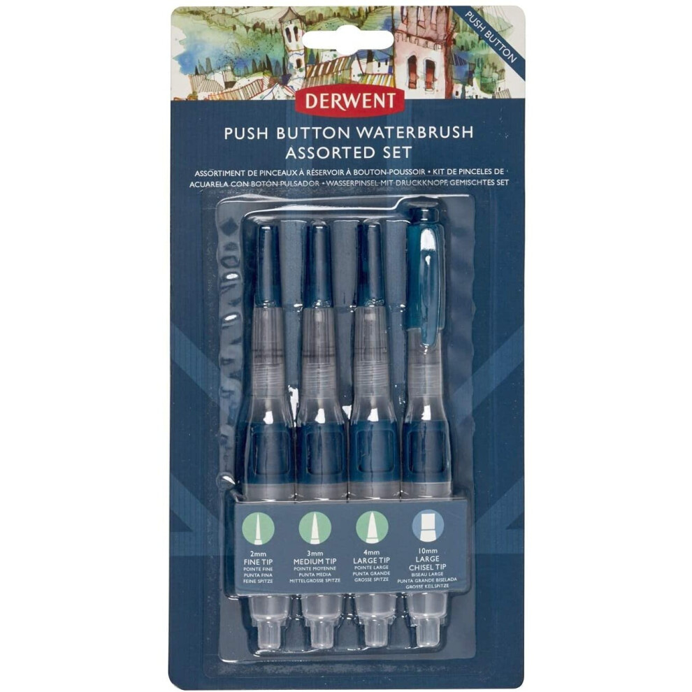 Derwent Push Button Assorted Size Waterbrush Set, contains 4 x premium watercolour brushes for use with watercolour pencils,Derwent Push Button Assorted Size Waterbrush Set, contains 4 x premium watercolour brushes for use with watercolour pencils, paints and blocks, leak...Price from £42.00 up to £42.42 Compare prices and buy Derwent Push Button Assorted Size Waterbrush Set, contains 4 x premium watercolour brushes for use with watercolour pencils, Onbuy.com (United Kingdom) →£42.00Onbuy.com (United Kingdom) →£36.00Compare prices2→