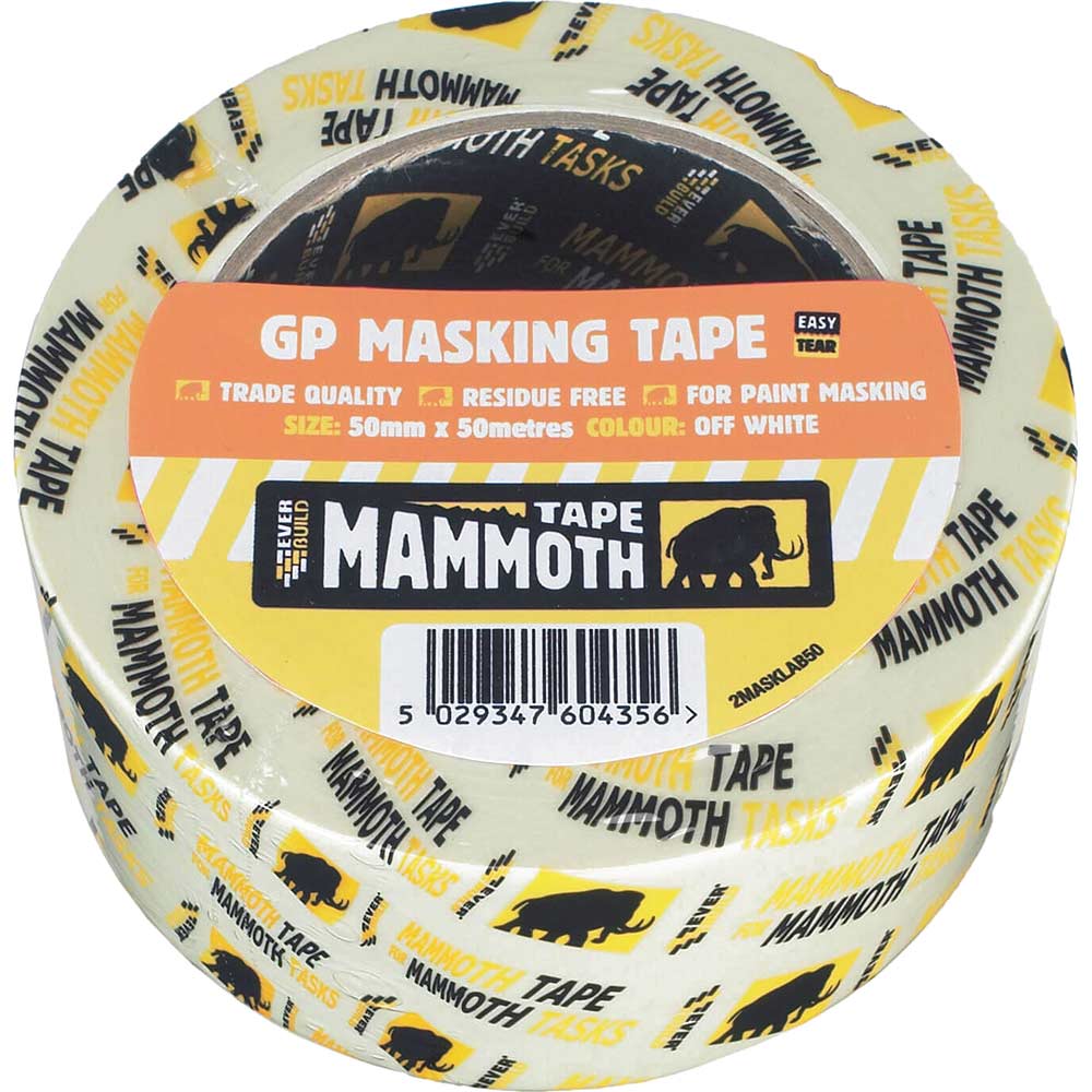 Everbuild Masking Tape 50mm 50m 2MASKLAB50The Everbuild Mammoth Retail Masking Tape in 50mm width x 50m length delivers substantial coverage for large-scale masking tasks. This wide format is perfect for protecting extensive areas such as broad skirting boards, large window frames, and substantial architectural features, significantly reducing application time on bigger projects. As a general-purpose, trade quality masking tape designed for conventional paint masking, it can be left in place for up to 3 days without leaving any residue. The tape features an easy-to-tear construction that speeds up workflow, whilst the 'Hotmelt' adhesive provides clean removal from all surfaces, ensuring no marks or damage remain after removal. The 50mm …Price from £2.93 up to £5.95 Compare prices and buy Everbuild Masking Tape 50mm 50m 2MASKLAB50 PowerToolsDirect.com (United Kingdom) →£3.00PowerToolsDirect.com (United Kingdom) →£4.00Bp-tools.co.uk (United Kingdom) →£5.00Tooled-up.com →£6.00Tooled-up.com →£6.00Compare prices6→
