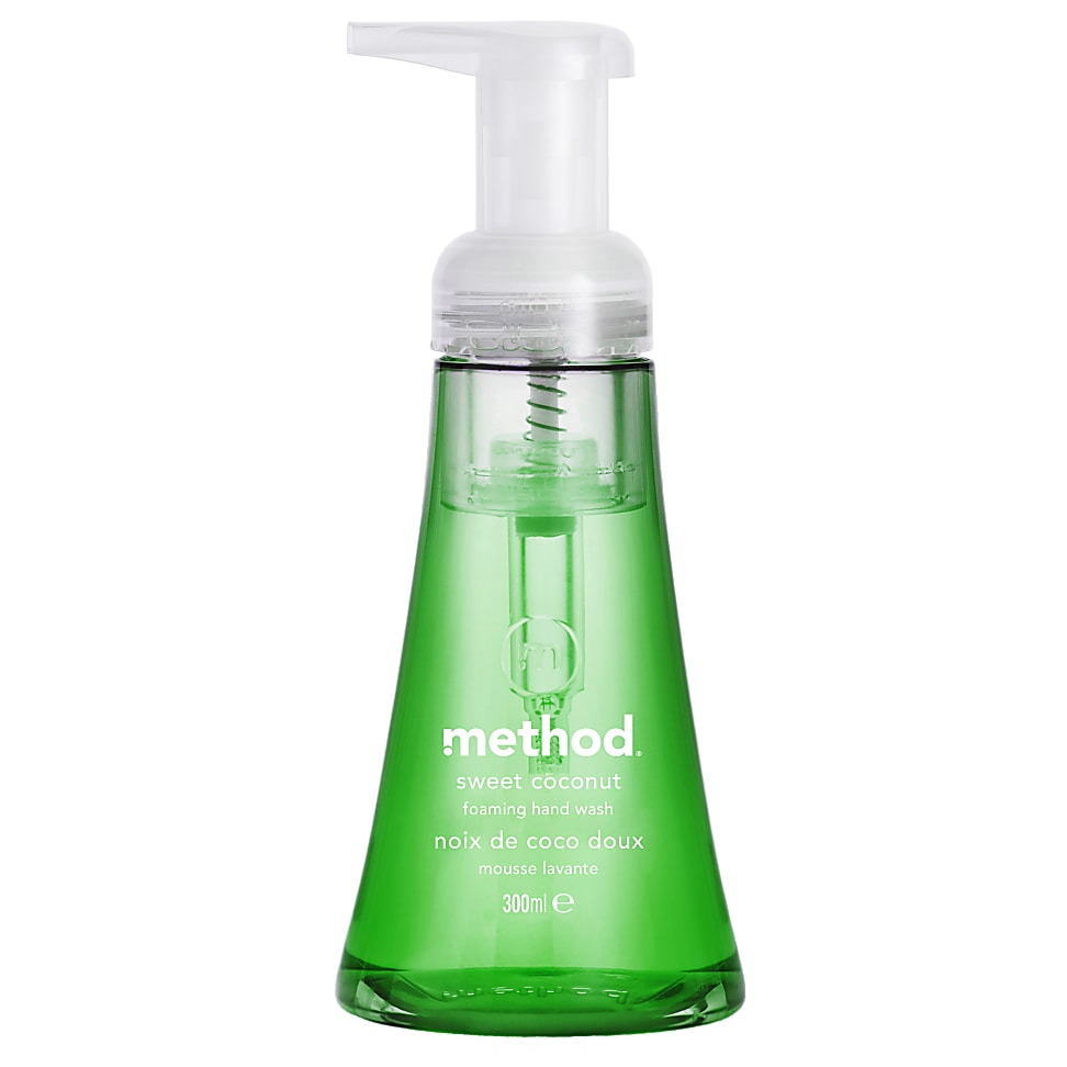 Method Foaming Hand Wash - Sweet Coconut MFOAMSWTCOCOfrom £4.00 up to £21.94 Compare prices3→Experience the joy of rich, foamy lather with Method Sweet Coconut Foaming Hand Wash. Infused with a sweet fragrance of coconut with top notes of fresh mint, this biodegradable formula gently cleanses more→and softens hands, leaving them feeling fresh and nourished. Sweet Coconut scent Gentle on skin Biodegradable formula Part of the Method Handcare range How to use: Pump a small amount of foam onto wet hands, and gently massage into your skin before rinsing with water. The special pump dispenses a ready-made foam, so there's no need to add extra water to create a lather.