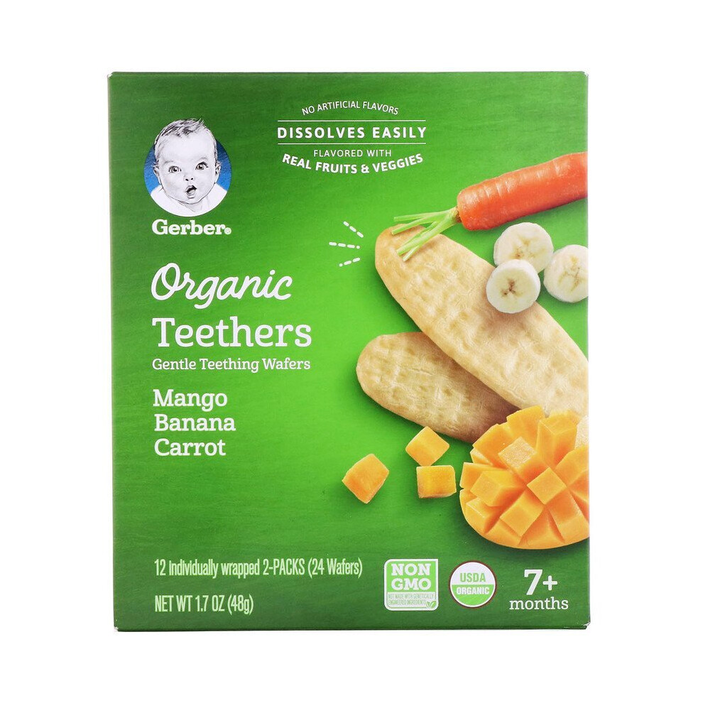 Gerber , Teething Wafers, 7+ Months, Mango Banana CarrotDescription No Artificial Flavors Dissolves Easily Flavored with Real Fruits & Veggies 12 Individually Wrapped 2-Packs (24 Wafers) Non GMO -...Price from £6.70 up to £15.99 Compare prices and buy Gerber , Teething Wafers, 7+ Months, Mango Banana Carrot iHerb.com (United Kingdom) →£7.00Onbuy.com (United Kingdom) →£16.00Compare prices2→