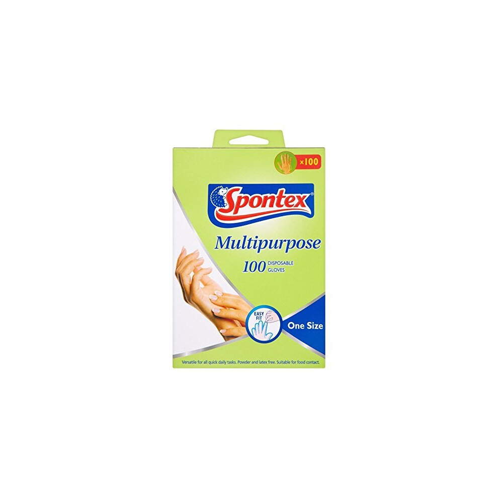 Spontex Multipurpose Disposable Gloves - 100 Pack Multipurpose Disposable Glovesfrom £6.50 up to £48.02 Compare prices2→Spontex Multi-purpose Disposable Gloves - 100 Pack Essential for a multitude of everyday tasks, these disposable gloves are perfect for cleaning, decorating, pet care and food preparation. They're lat more→ex and powder-free and made of a tough material for enhanced grip, so they're ideal for precision tasks. Plus, the handy dispenser packaging makes it quick and hygienic to pull out a fresh pair.
