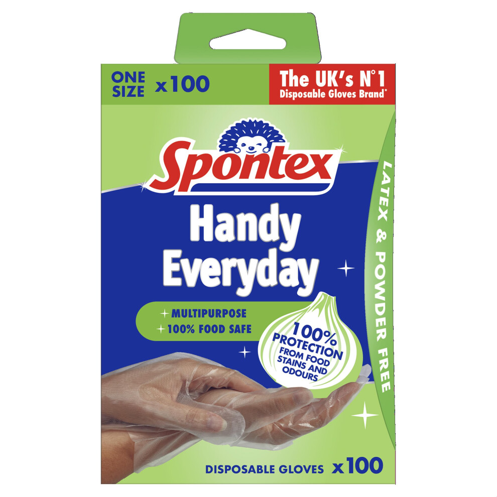 Spontex 100 Handy Multipurpose Disposable Gloves |12.77Buy!£OnBuy.comDelivery: in United Kingdom ReportSpontex 100 Handy Multipurpose Disposable Gloves | Easy fit and versatile for everyday tasks. 100% food contact approved. Latex free. Powder free.