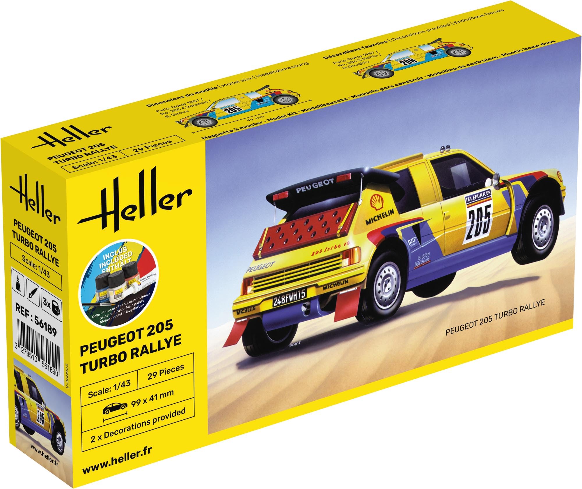 Heller Maqueta Multicolor 56189 (56189)12.17Buy!£rarewaves.comDelivery: in United Kingdom ReportHeller- Maqueta Multicolor (56189)DESCRIPCIÓN DEL PRODUCTO DESCRIPCIÓN DEL PRODUCTO Contiene pegamento pinceles colores principales. Para probar la resistencia de sus vehículos Peugeot participó reg more→ularmente en manifestaciones. Una estrategia particularmente exitosa para el 205 con la que el director deportivo Jean Todt obtuvo el título mundial a Sochaux dos veces. Pero especialmente entre 1987 y 1990 en el famoso Rally de París-Dakar el 205 confirmó su superioridad y ganó notoriedad. ADVERTENCIA DE SEGURIDAD No apto para niños menores de 14 años.