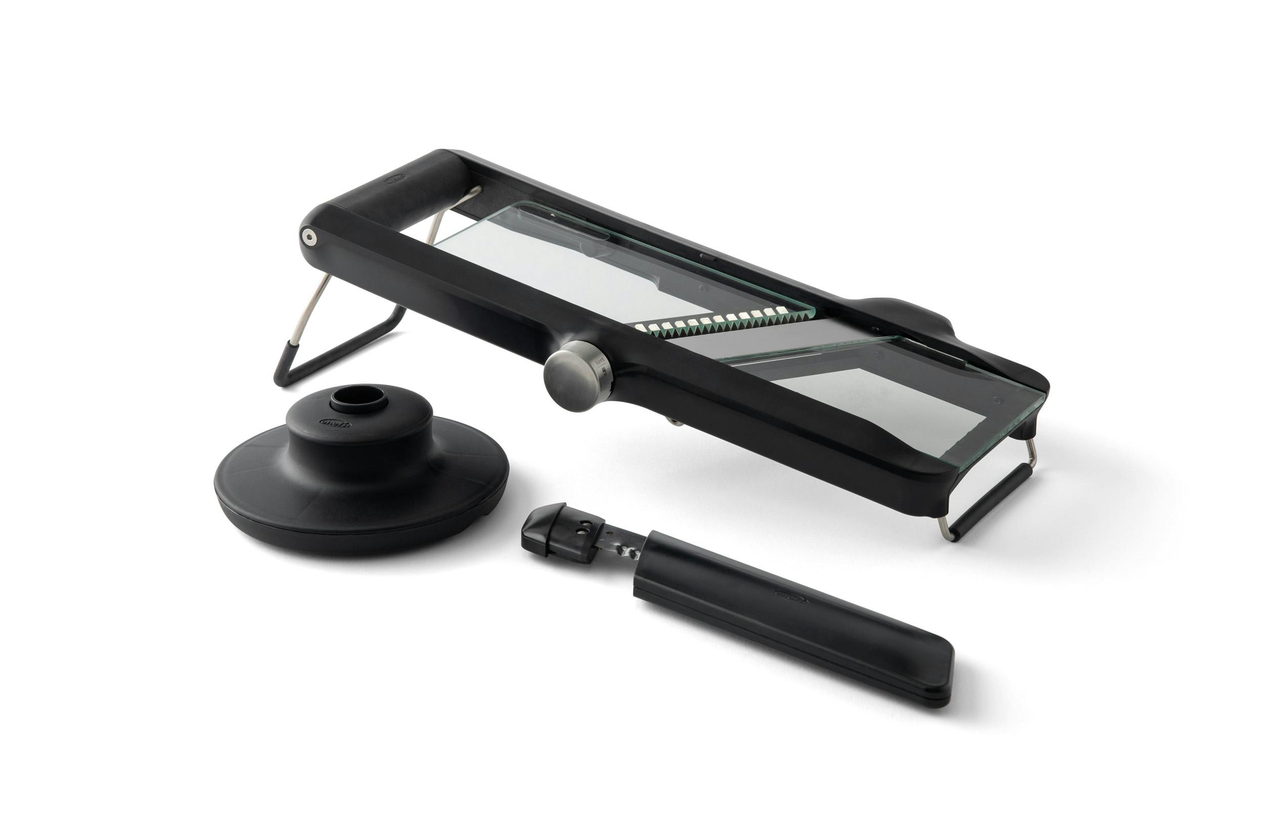 OXO Good Grips Chef's Mandoline 11264100V1UK63.75Buy!£Hartsofstur.comDelivery: in United Kingdom ReportCreate up to 21 different cuts and thicknesses with the OXO Good Grips Chefs Mandoline 2.0.An indicator window clearly displays the thickness setting in both millimeters and inches and which can be se more→t in 0.5mm intervals.The two-sided Japanese stainless steel blade creates straight or crinkled slices and is angled so that even soft foods can be sliced with ease. There are also integrated Julienne and French fry blades.To protect fingers, the spring-loaded food holder has a wide rim and can be stored on the underside of the mandoline when not in use. For further safety this OXO chefs mandoline features a comfortable soft, non-slip handle.The OXO Good Grips Chefs Mandoline 2.0 also features a …