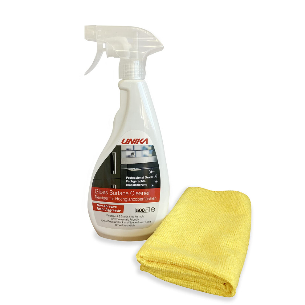 Unika Non-Aerosol Gloss Surface Cleaner & Microfibre Cloth 500ml CLEANGLOSSP500from £18.00 up to £18.38 Compare prices1→Features Suitable for high gloss surfaces, glass, chrome Anti-static cleaner perfect for gloss kitchens Reduces static pick up so reduces dust...
