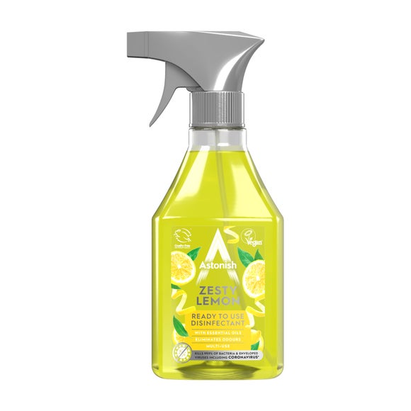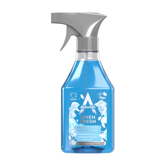Astonish Zesty Lemon Spray 500mlfrom £2.00 up to £18.99 Compare prices3→* With essential oils* Eliminates odours* Multi-use* Cruelty Free* Certified Vegan Astonish Linen Fresh Ready To Use Disinfectant kills 99.9% of bacteria and enveloped viruses including coronavirus*.
