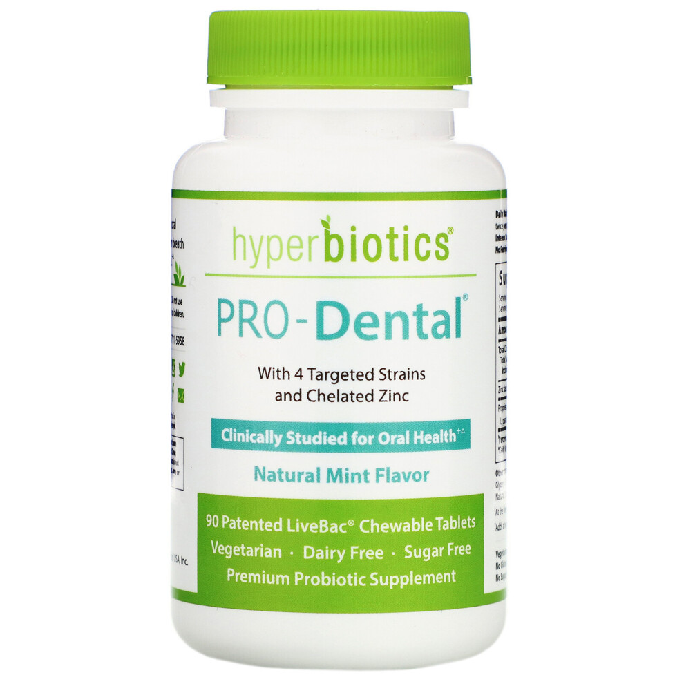 | Product Description: SupplementVegan and non-GMO, intensively supports oral and metabolic health. How to use the product: Chew and dissolve 1 tablet 1-2 times a day or follow the doctor's instructions. No need to refrigerate. Ingredients: Isomalt, inulin, microcrystalline cellulose, glyceryl behenate, di-calcium phosphate, natural peppermint flavor, natural spearmint flavor, Stevia (Stevia rebaudiana) leaf extract. Free from: gluten, dairy products, peanuts, tree nuts, fish. , does not contain shellfish, crustaceans, soybeans, sesame seeds, eggs, artificial flavors, colors, sweeteners, or unnecessary additives. No.¤Contains a small amount of sugar. Precautions: Store tightly closed in a c… | Price from £31.08 up to £78.00 Compare prices and buy Hyperbiotics Vital Nutrients, ®, Pro-Dental® Probiotic, Natural Mint Flavor, 45 Vegan Chewables Compare prices3→ |