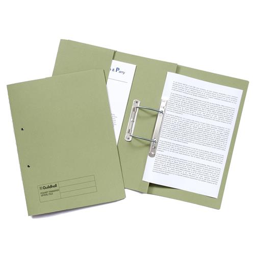 SPRING Guildhall Pocket Transfer File Manilla Foolscap 285gsm Green - 347-GRNZ 347-GRNZ (Pack 25)from £40.64 up to £59.67 Compare prices4→These strong 285gsm folders create a stylish filing solution for reports presentations and more and are ideal for use in the office home or classroom. The metal spiral fitting secures punched papers i more→n place and allows them to be worked on whilst in the file. The useful pocket also allows you to store unpunched papers. These colourful files can be used as part of a colour coordinated filing system and have a 350 sheet capacity.