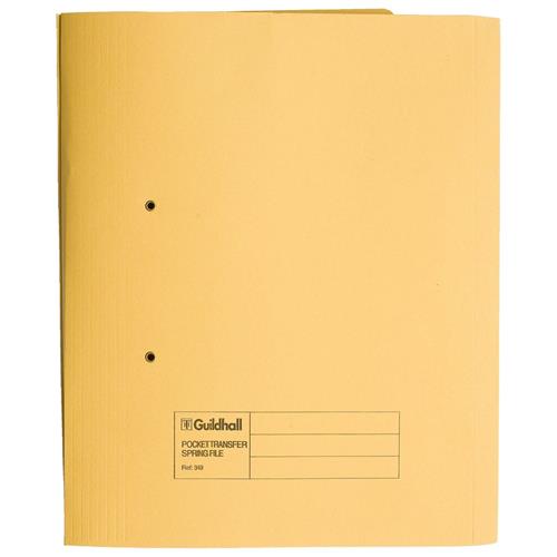 SPRING Guildhall Pocket Transfer File Manilla Foolscap 285gsm Buff - 347-BUFZ 347-BUFZ (Pack 25)from £34.20 up to £59.67 Compare prices6→These strong 285gsm folders create a stylish filing solution for reports presentations and more and are ideal for use in the office home or classroom. The metal spiral fitting secures punched papers i more→n place and allows them to be worked on whilst in the file. The useful pocket also allows you to store unpunched papers. These colourful files can be used as part of a colour coordinated filing system and have a 350 sheet capacity.