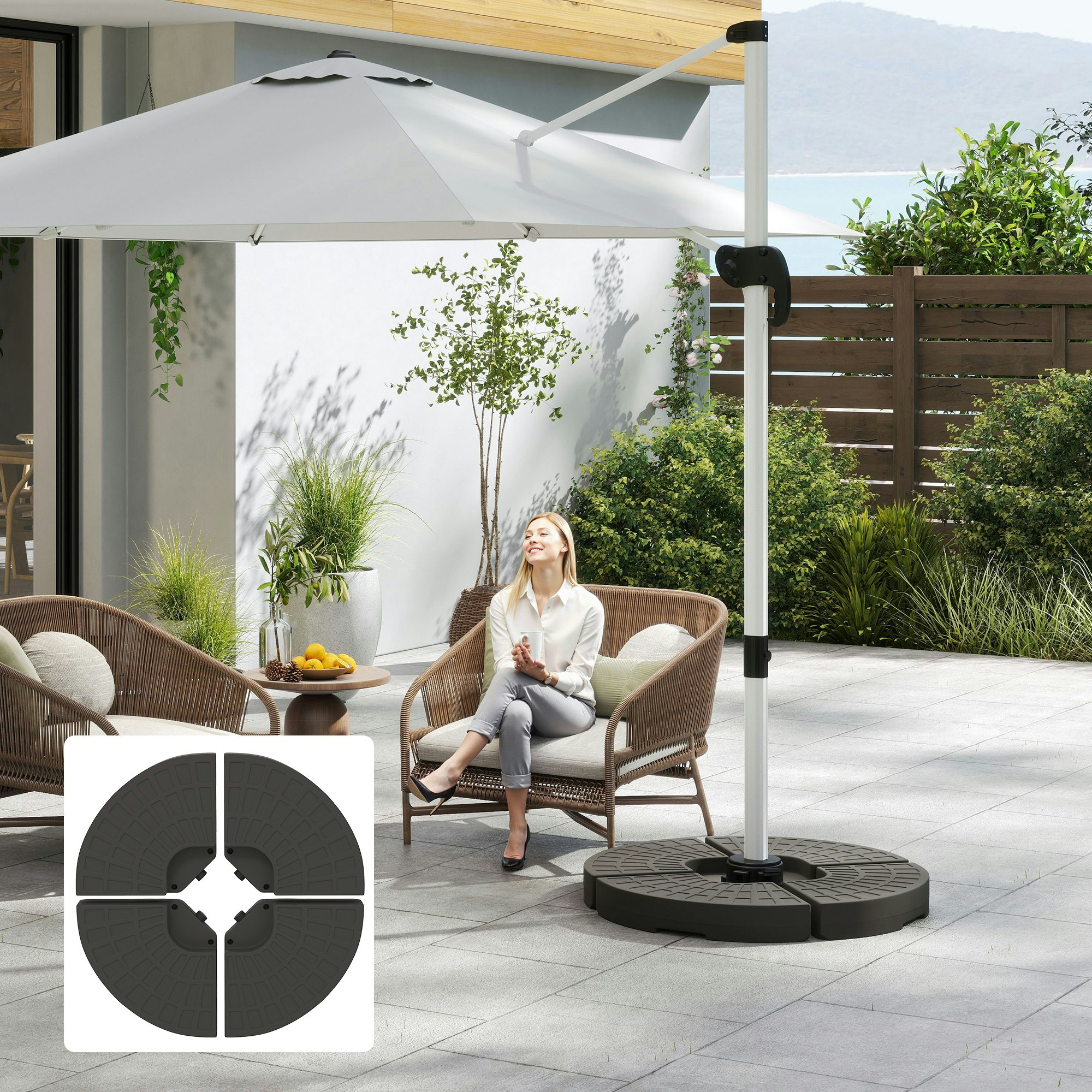 Outsunny Rackhams 4PCs Cantilever Offset Patio Base Stand, Water & Sand Filledfrom £49.99 up to £60.18 Compare prices4→Keep your cantilever parasol securely positioned with this 4-piece parasol weight set from Outsunny. Designed to fit together easily, each section forms a stable base that can be filled to add weight more→where you need it most, helping your sunshade stay firmly in place for outdoor use. Made from strong HDPE plastic, the set can hold up to 17kg of water weight, or up to 25kg when filled with a water and sand mix. When empty, the pieces are light enough to carry, making it simple to move your parasol setup to your preferred spot. Suitable for home settings as well as commercial spaces such as coffee shops and pubs. Key features 4-piece cantilever parasol base weight set Made from strong HDPE plastic …
