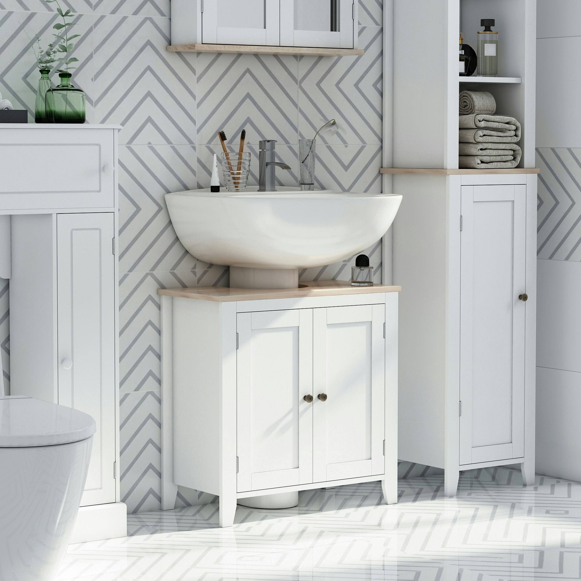 HOMCOM Rackhams Bathroom Pedestal Under Sink Cabinet Floor w/ Storage Shelf Double Doorfrom £54.99 up to £57.99 Compare prices3→This kleankin under-sink cabinet is designed to add practical storage when bathroom space is limited. Finished in a clean white and wood-effect colour scheme, it features a boxy shape for a timeless, more→understated look. Made from MDF, the unit includes a ‘U’ shaped cut-out on the top so it can slot around sink pipework. Inside, an adjustable shelf helps you organise bathroom essentials, while the double doors are finished with handles for easy opening and closing. Key features Under-sink cabinet designed for bathroom storage White and wood-effect colour scheme Boxy shape Material: MDF ‘U’ shaped cut-out to fit around sink pipes (please measure before purchasing) Inner adjustable shelf Double d…