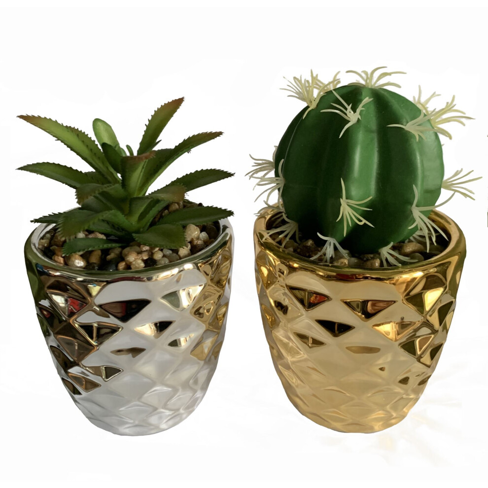 Leaf 15cm Set of Two Silver and Gold Ceramic Planters with Artificial Cactus and Dracaena18.94Buy!£Onbuy.comDelivery: in United Kingdom ReportSetofTwoSilverandGoldCeramicPlanterswithArtificialCactusandDracaena.15cmoverallheight.Pot7cmx7cm.