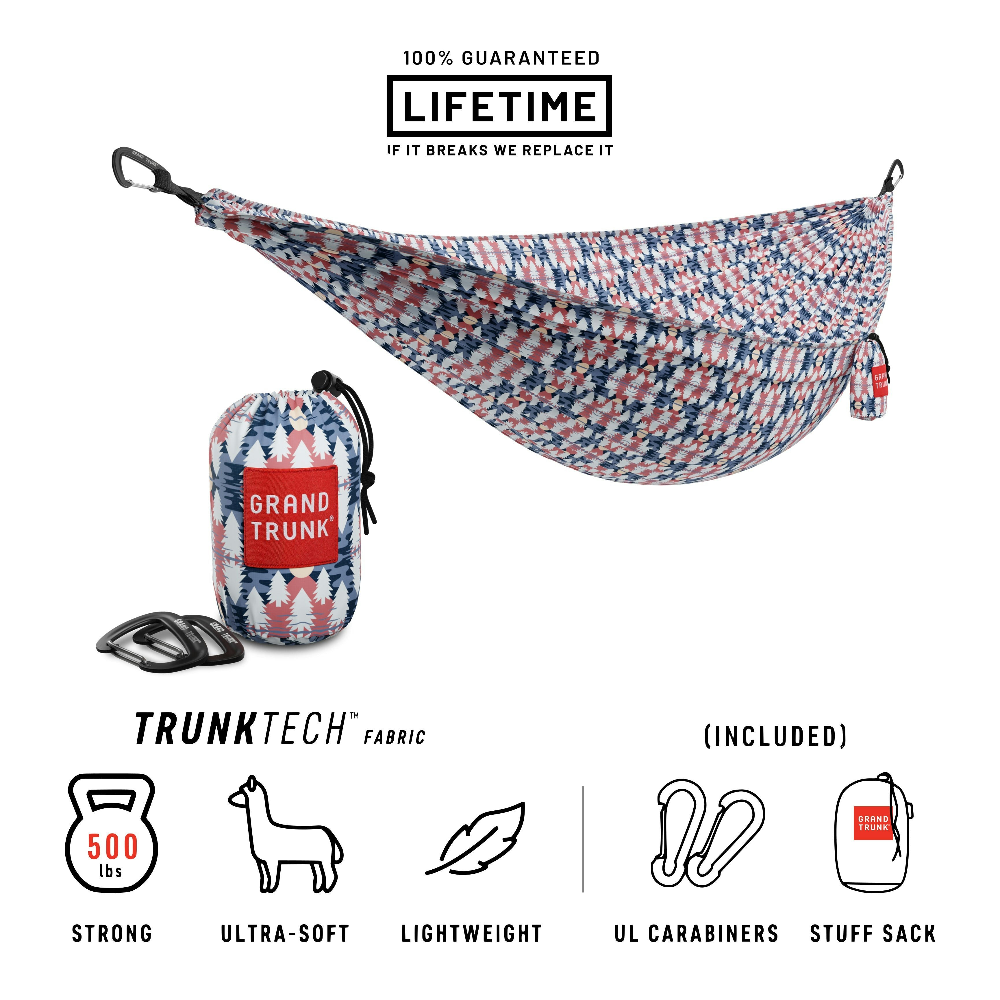 Rackhams TrunkTech™ Double Hammock PRINTED - Wild Forestfrom £75.00 up to £80.66 Compare prices3→Description THE BEST HAMMOCK ON THE PLANET! Introducing the next generation of hammocks woven for explorers. TRUNKTECH™ is purposefully built for hammocks and technology driven to deliver unparallel more→ed softness, strength, and breathability that even the most rugged of travellers will appreciate. TRUNKTECH™ hammocks pack down smaller than an ordinary parachute nylon hammock and nearly cuts the weight in half. It's all made possible with our specially designed Ripstop Nylon fabric. Woven like a fortress and designed to provide matchless comfort, TRUNKTECH™ hammocks are the future of adventure hammocks! Hanging kit/straps are not included. Features - Stronger, lighter and more compact than…