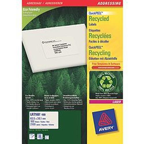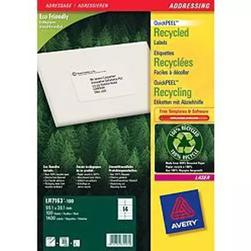 Avery QuickPEEL self-adhesive label White 800 pc(s) LR7165-100from £26.34 up to £43.21 Compare prices10→Looking for an eco-friendly label? Look no further than Avery recycled laser labels. If you work in an eco-friendly office you want to make sure you are doing all you can to protect the environment. T more→hese labels are 100% recycled labels and backing sheet has a water based adhesive. These labels are 99.1 x 67.7mm in size and there are 8 on each printable sheet. With 100 sheets in a pack thats 800 labels in total. Not only that there has been no additional forest clearance and less use of energy and water in the production process. These natural white recycled address labels give you peace of mind that you are doing your bit to protect the environment. Printing is easy with free software from …