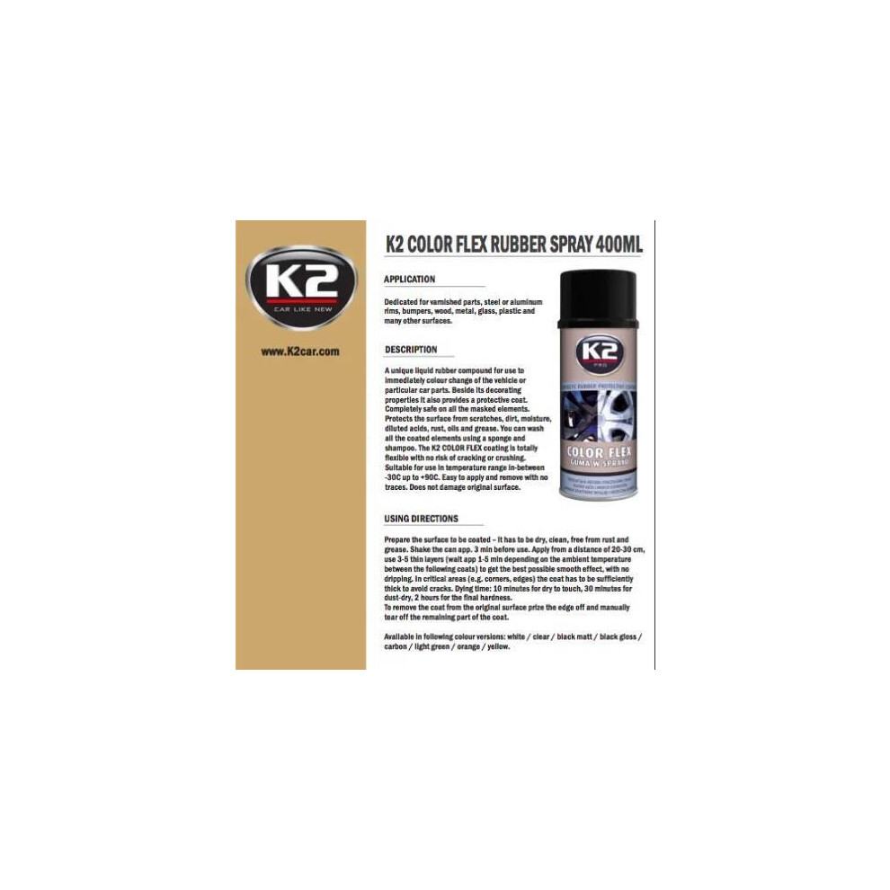 K2 Color Flex White Plastic Peelable Rubber Skin Spray Can Paint Aerosol 400mlK2WHITE PLASTIWRAP PLASTICPEELABLERUBBERSKINSPRAY DESCRIPTION K2ColorFlexLiquidRubberCoating- 400ml ... £9.95OnBuy.comDelivery: in United Kingdom ReportBuy!