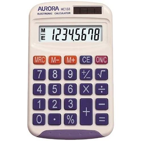 Aurora HC133 Handheld 11597Jfrom £3.46 up to £11.03 Compare prices2→The Aurora HC133 is an ideal calculator for general use, it has a large clear 8 digit LCD display to enable easy viewing and is solar powered with a battery backup for reliability. The calculator is d more→esigned for ease of use and has a spacious keypad