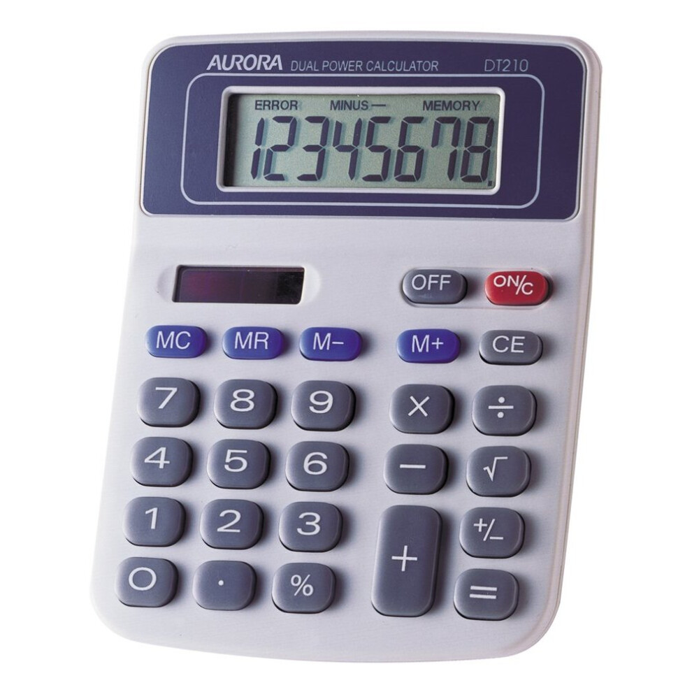 Aurora DT210 Desktop Basic Greyfrom £3.85 up to £13.23 Compare prices7→- Robust model for everyday handheld or desktop use. - Spacious keypad for easy entry. - Large 8 digit fixed angle display for optimum viewing. - Durable hard keys. - 4 key more→memory. - Constants: Addition Division Multiplication & Subtraction. - Percentage & Square root keys. - +/- Change sign key. - Rubber feet (For desk-top use). - Solar powered with battery backup (Included). - Manual and Auto power off.