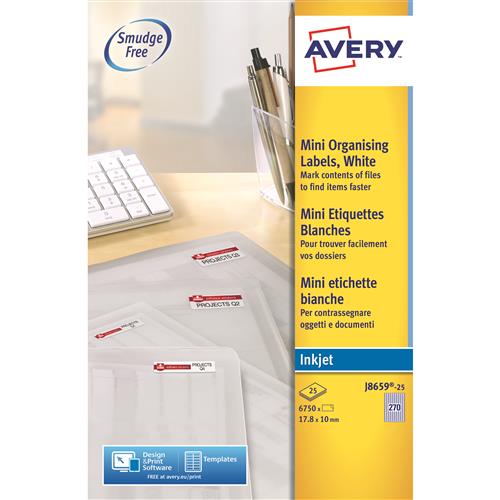 InkJet Avery Mini Labels White J8659-25Avery Mini inkjet address labels are ideal for return address labels. If you have dozens of jobs to be getting on with mailings and mail-merges are made easy with Avery these labels are easier to peel and faster to apply with the unique Quick Peel feature to save you time and effort. You simply divide the sheet along the perforation to expose the label edges and then peel and apply to any envelope. You can also peel and apply in the normal way. Ink dries instantly on these Quick Dry labels for a perfect smudge free result each time you print. These adhesive labels are ideal for a variety of applications they are great for labelling files folders documents stationery and anything else with a …Price from £13.98 up to £30.30 Compare prices and buy InkJet Avery Mini Labels White J8659-25 OfficeStationery.co.uk (United Kingdom) →£14.00OfficeStationery.co.uk (United Kingdom) →£15.00Euroffice.co.uk (United Kingdom) →£17.00UKOfficeDirect.co.uk (United Kingdom) →£17.00RefreshCartridges.co.uk (United Kingdom) →£19.00Compare prices10→