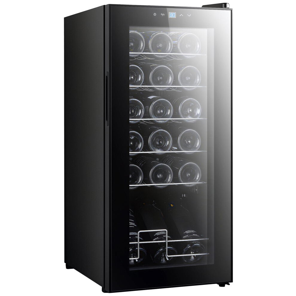 | 35dB operation: Back bar fridge operates at 'E' energy efficiency. Quiet operation, whilst helping to keep electric bills low. Features: 8-18? adjustable temperature, with LED display: Easy to control and change coolness of drinks fridge. Keeps wine, prosecco, champagne and beer cooled how you want 35dB operation: Back bar fridge operates at 'E' energy efficiency. Quiet operation, whilst helping to keep electric bills low Two racks, holds six bottles: Lots of room in this wine cooler. Adjustable height, and also removable to fit in larger wines, champages and other bottles when required. Inner blue light to see inner contents easily UV-resistant triple glass door: Safe front to this wine fridge.… | Price from £89.99 up to £105.00 Compare prices and buy HOMCOM Mini Beer and Wine Fridge, 6 Bottle, with Glass Door, Touch Screen, Black 800-245V70BK Compare prices4→ |
