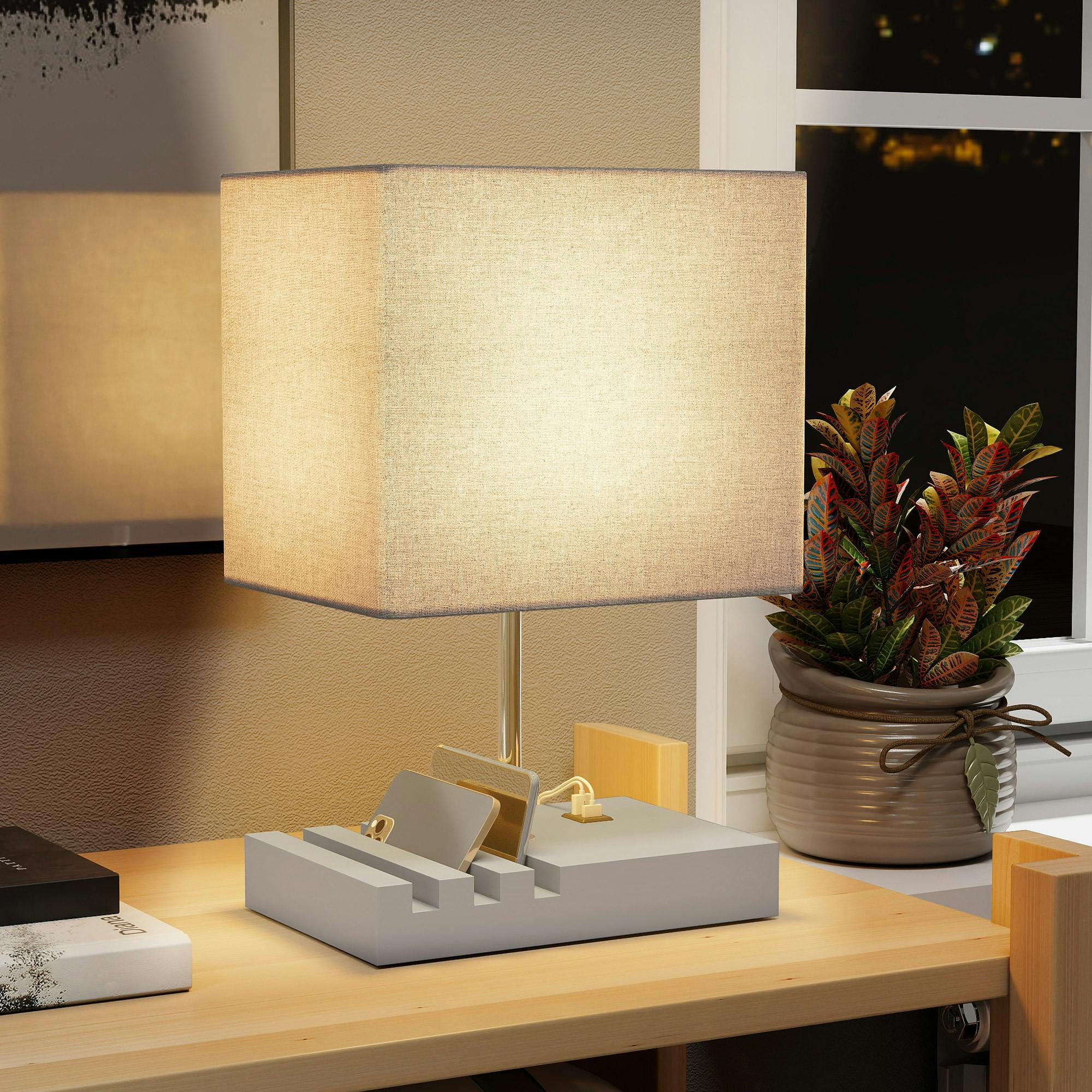 HOMCOM Rackhams Table Lamp with 3 Slots, Bedside Lamp with Solid Wood Base - Greyfrom £17.59 up to £27.99 Compare prices3→The HOMCOM Table Lamp is designed to bring order to your bedside setup, combining lighting with practical device organisation. With integrated USB-A and USB-C ports, it offers a convenient way to powe more→r compatible devices from one place, helping to keep charging within easy reach. Built with three organiser slots, this bedside lamp provides a simple solution for storing small essentials neatly alongside your lamp. Finished with a solid wood base and a fabric shade, it suits modern interiors while keeping your nightstand looking tidy and considered. Key features Table Lamp design for bedside use Integrated USB-A and USB-C ports for charging compatible devices Three organiser slots for …