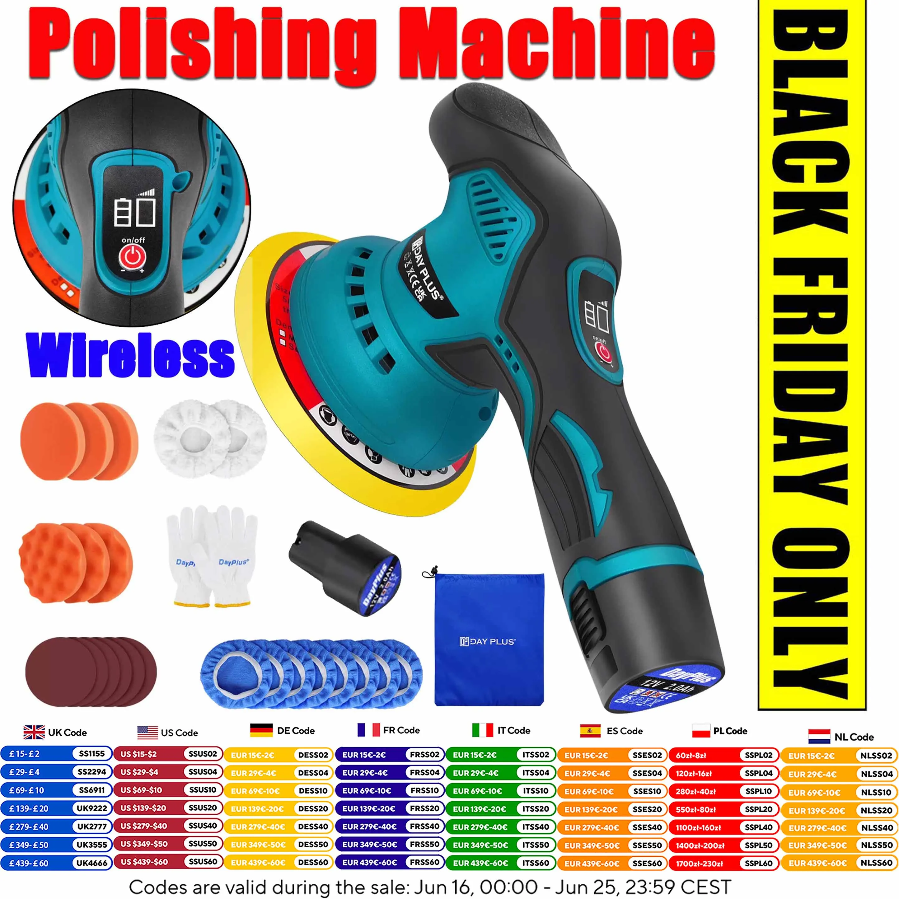 DayPlus Brushless Cordless Buffer Polisher,2000mAh 12V Buffer Kit+8 Variable Speed,2800-5500RPM for Car Detailing,Boat,Wall,Brushless Cordless Buffer Polisher,2000mAh 12V Buffer Kit+8 Variable Speed,2800-5500RPM for Car Detailing,Boat,Wall,Floor,DIY £62.18Aliexpress.comDelivery: to United Kingdom ReportBuy!