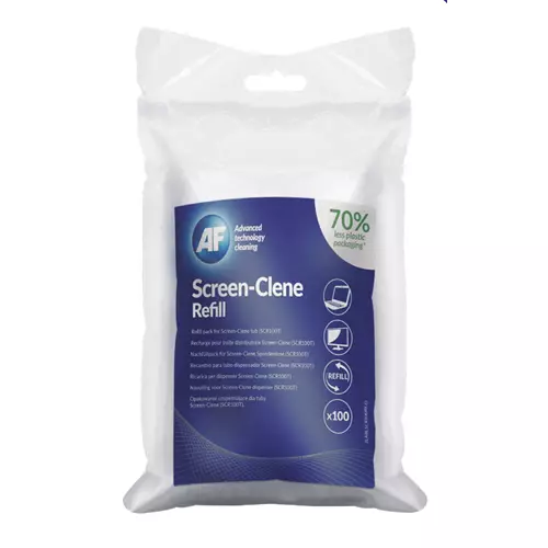 Refill AF SCR100R disinfecting wipes 100 pc(s) 30005439.0001EAA refill pouch of 100 wipes for SCR100T dispensing tub. AF Screen-Clene Wipes are specialist anti-static screen cleaning wipes impregnated with a gentle non smear alcohol free solution. Supplied in a convenient re sealable tub to lock in freshness. These fully recyclable paper wipes are ideal for cleaning smartphones tablets laptops monitors TVs TFTs and LCD screens to leave a smear free finish. The anti static properties prevent dust build up with regular use. Save up to 70% plastic by using refill pouches for future use. Glasses lenses this product is unsuitable for coated lenses. Always check with the manufacturer for guidance before use. AF International always recommends that >>>>>>… £12.15Quzo.co.ukDelivery: to United Kingdom ReportBuy!