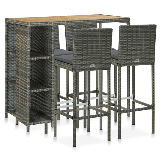 Selah Rattan Bar Table With 4 Audriana Chairs In Oak And Grey 3095460.VXL599.95Buy!£Furnitureinfashion.netDelivery: to United Kingdom ReportThis garden bar set has an elegant design and will be the focal point of your garden, patio or terrace. FEATURES : Table Material : PE rattan, steel, acacia wood with an oil finish Table Finish : Gr more→ey, Natural Chair Material : PE rattan, steel Chair Finish : Grey Made of weather-resistant and waterproof PE rattan, this bar set is easy to clean, hard-wearing and suitable for daily use The powder-coated steel frame makes the table and stools very sturdy and durable Thanks to the lightweight construction, all items are easy to move The thick, removable seat cushions are highly comfortable The cushion covers with zippers can be easily removed and washed In order to extend the life of