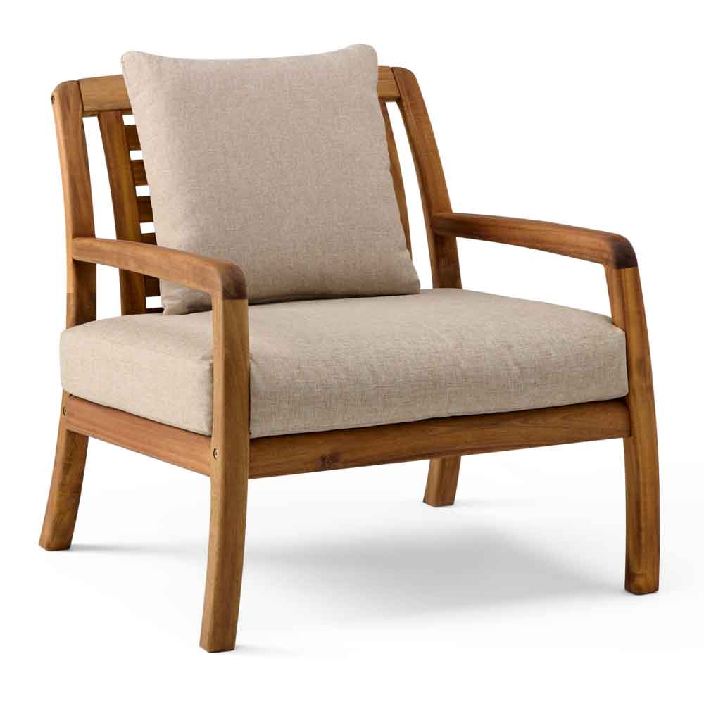 Ozone Wooden Lounge Chair in Natural 4621.ALX419.95Buy!£Furnitureinfashion.netDelivery: to United Kingdom ReportAdd a touch of timeless elegance and comfort to your outdoor space with the Ozone Outdoor Wooden Lounge Chair in Natural by Furniture in Fashion. Inspired by classic garden furniture design, this beau more→tifully crafted lounge chair offers a perfect place to unwind, whether you're enjoying a quiet afternoon or entertaining guests. Its clean lines and natural wood tones make it a versatile addition to patios, gardens, and terraces. Expertly constructed from premium acacia hardwood, this lounge chair features a smooth oiled finish that enhances the natural grain while providing durability for outdoor use. Complete with comfortable seat and back cushions, it combines style with relaxation. Designed
