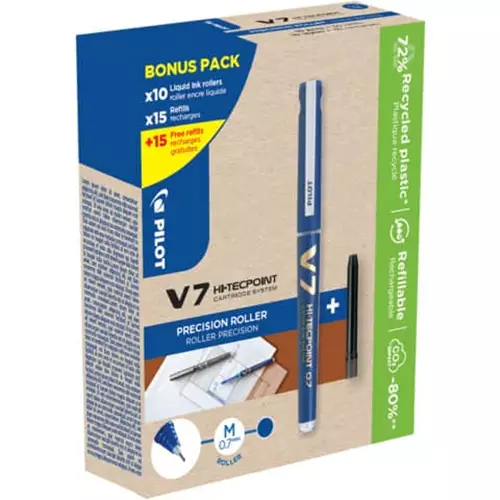 Pilot V7 HI-TECPOINT GREEN PACK Stick pen Blue 10 pc(s) WLT556268PILOT GREEN PACKS THE TRASH CAN WAIT! Refilling your pen rather than the bin is now much easier with the Pilot Green Packs - Convenient sets of either 10 or 12 pens made from recycled materials with additional refills. At Pilot we do not expect you to throw away your pen just because you have used up all of the ink and we encourage the use of refills. Using a refill when the ink runs out rather than a new pen will extend the products life and further reduce the amount of plastic which would otherwise prematurely go to landfill. Using refillable pens and Pilot Green Packs can also help reduce greenhouse gases because manufacturing an entire pen produces more CO2 than just the refill >>>>…Price from £24.79 up to £36.56 Compare prices and buy Pilot V7 HI-TECPOINT GREEN PACK Stick pen Blue 10 pc(s) WLT556268 OfficeStationery.co.uk (United Kingdom) →£25.00Quzo.co.uk →£37.00Compare prices2→