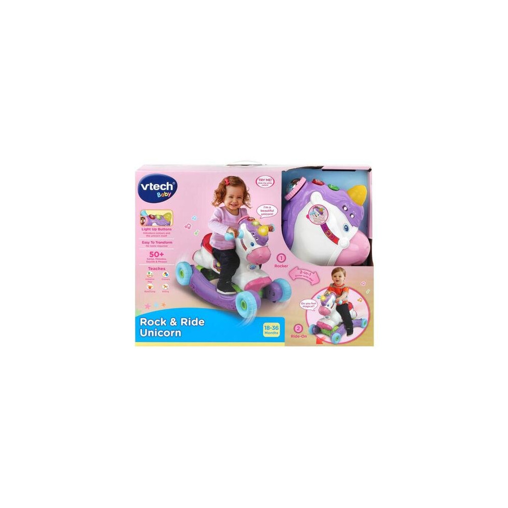 Vtech Rock & Ride Unicorn Toy VTC-TOY03from £46.99 up to £59.99 Compare prices6→The VTech Rock & Ride Unicorn Toy is a delightful musical companion featuring a gentle rocking motion, interactive sounds and cheerful melodies. Designed to encourage sensory development, coordination more→and rhythm, this colourful unicorn brings imagination and music together for young children.InformationBrand: VTechType: Musical & Activity ToyFeatures: Rock-and-ride motion • Music, sounds and songs • Encourages sensory development & coordination • Bright, child-friendly design • Ideal for young children
