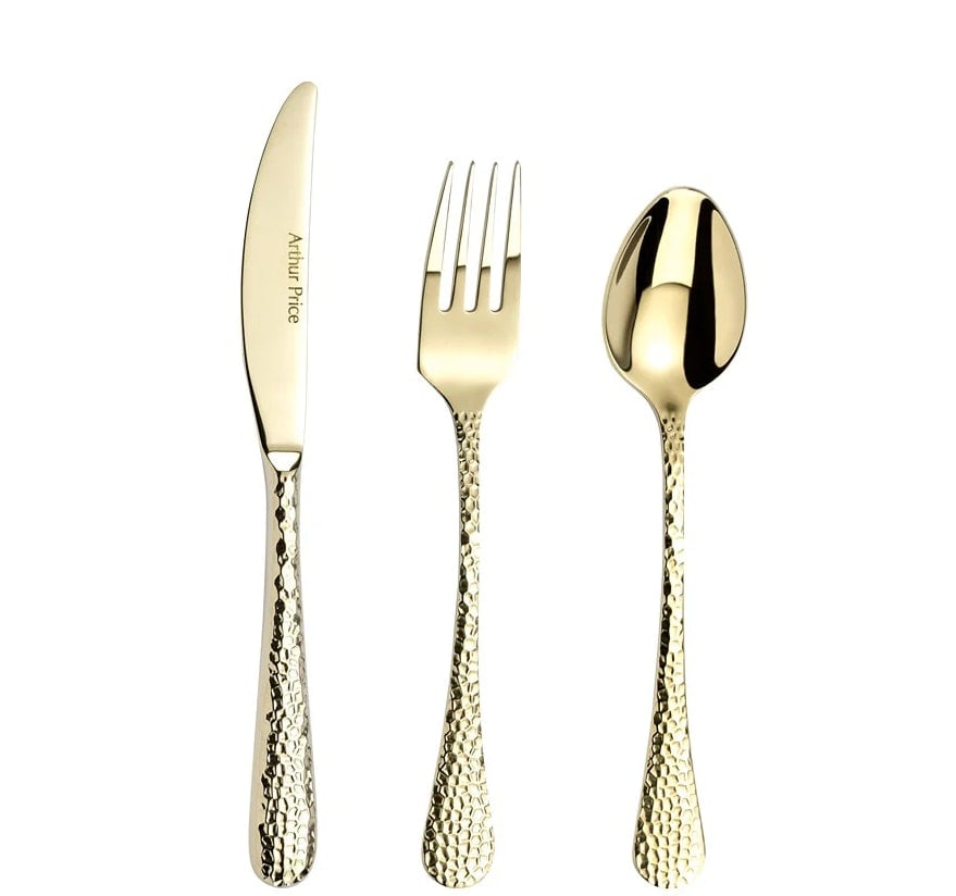 Arthur Price Rackhams 'Champagne Avalon' Stainless Steel Gift Boxed Children's Knife Fork Spoonfrom £19.50Compare prices2→A new cutlery collection from Arthur Price. Available in 18/10 stainless steel and champagne gold, all stunningly packaged. Champagne Avalon beautifully combines traditional and modern design elements more→. It lends itself to everyday use and special occasions. Each piece has a hammered textured finish to the handle which adds interest and perfect for catching the light and adding glamour to any table setting. Champagne Avalon is decorated with a subtle champagne PVD coating which stands for Physical Vapour Deposition using non-toxic materials such as Titanium. PVD coatings are hard wearing, hypoallergenic and completely food safe. Produced from the finest 18/10 stainless steel, dishwasher safe …