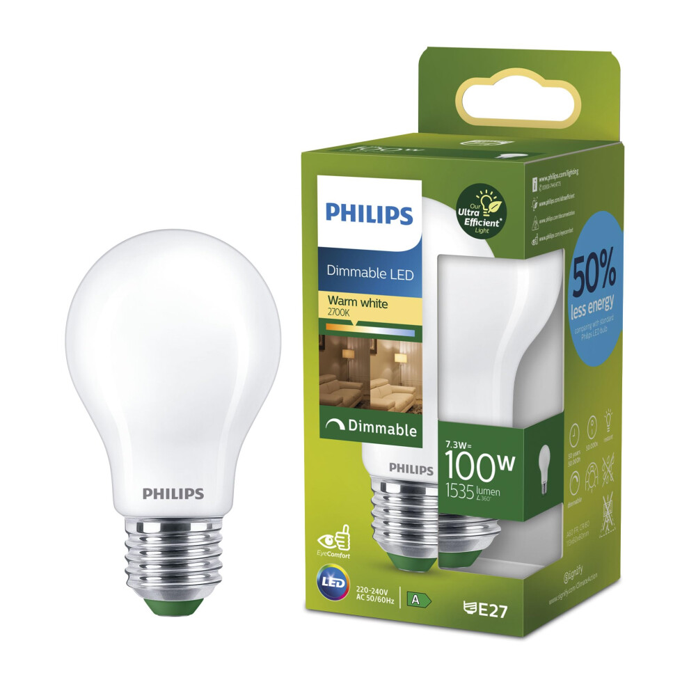 Philips LED Light Bulb Classic, UltraEfficient,100W, 1535Lm, A60, E27 2700K, Frosted Glass, dimmable18.87Buy!£Onbuy.comDelivery: in United Kingdom ReportPhilips LED Light Bulb Classic, UltraEfficient,100W, 1535Lm, A60, E27 2700K, Frosted Glass, dimmable Industry-leading energy efficiency - Our...