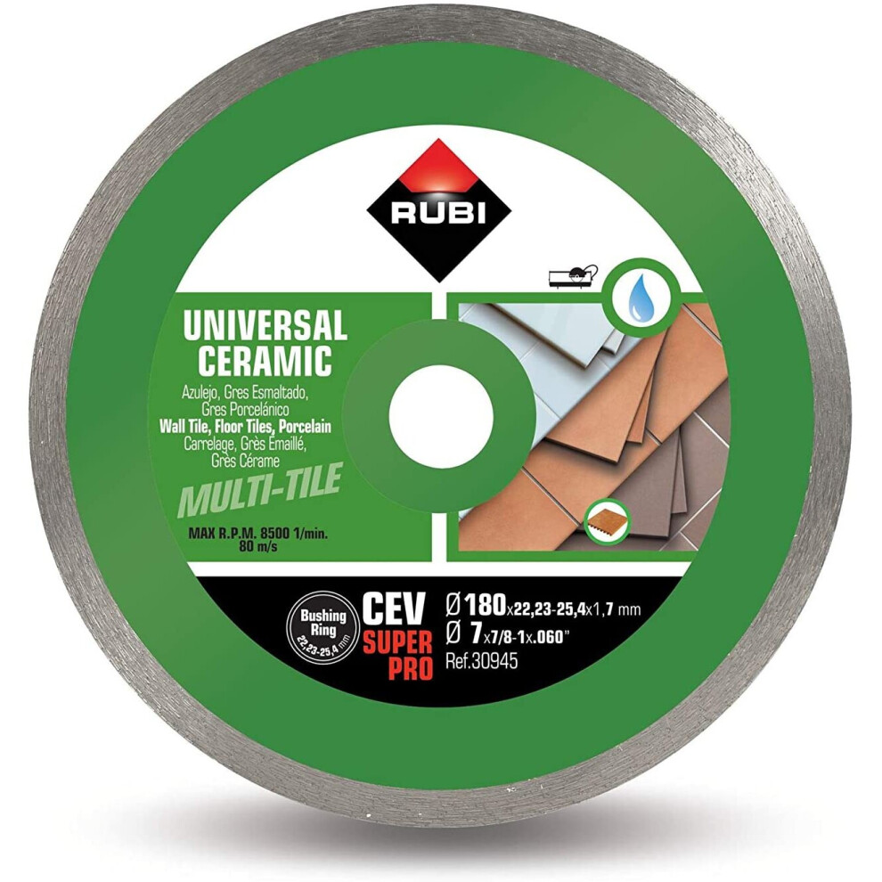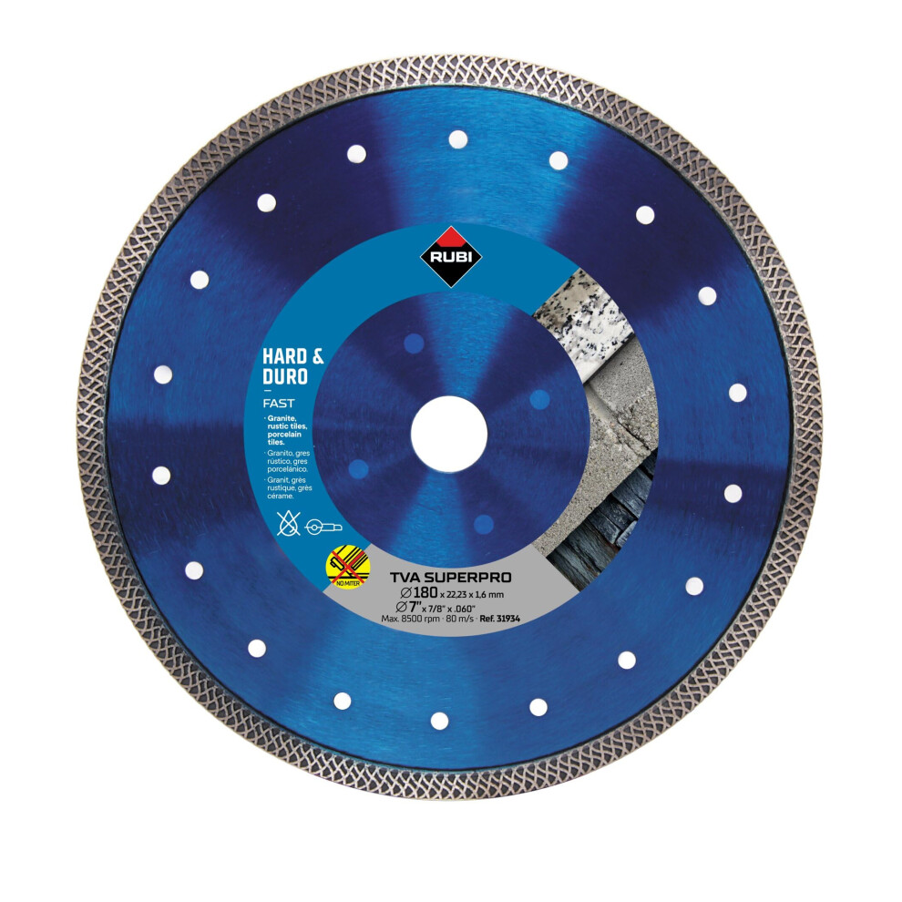 | Diamond disc tvr 115 superpro 30986 rubi. recommended for dry cutting of hard materials such as: granite, rustic stoneware, clinker, refractory, slate and, of course, porcelain stoneware. great speed and resistance in cutting the hardest materials, without giving up the quality of the finish. central reinforcement in the steel core that gives it greater resistance to flexion.Specifications:- Units per box: 5- Weight: 0.03kg- Type: Diamond blade- Measurements: ø115mm- Material: Diamond- Model: TVR- Application: Granite, stoneware, clinker, refractories | Price from £31.99 up to £45.93 Compare prices and buy RUBI Tvr 115 Super Pro 115 Mm Diamond 30986 Compare prices6→ |