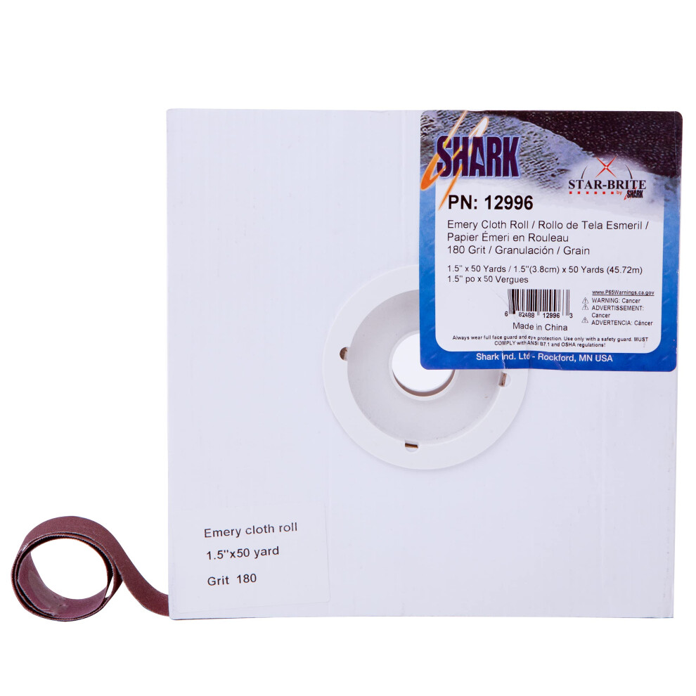 SHARK 12996 1.5-Inch by 50-Yards Aluminum Oxide Emery Cloth Roll 180-GritProductDescriptionAbrasiveemeryclothrollsformostshopneedsAvailablein1-Inchand15-InchwidthsIthasamultitudeofuseandisgreatforrustremovalandmetalsanding. £52.71OnBuy.comDelivery: in United Kingdom ReportBuy!