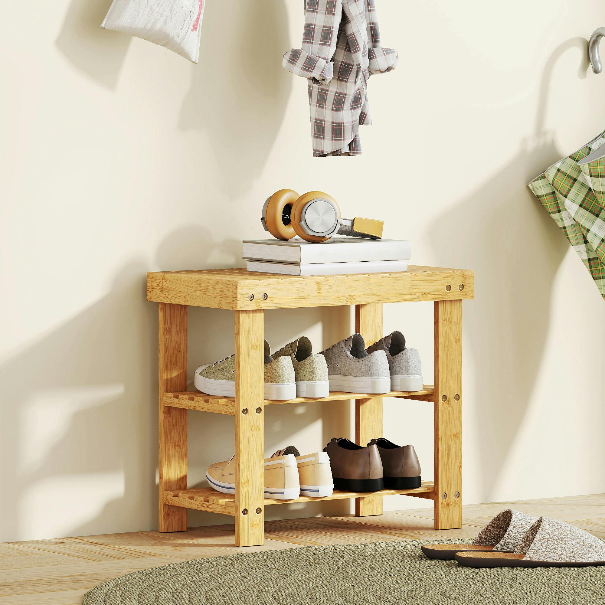 HOMCOM Rackhams 3-Tier Bamboo Shoe Bench with 2 Shelves for Entryway, White - Natural wood finishfrom £22.00 up to £22.99 Compare prices3→The beautiful way to hold footwear and give you a place to change - this HOMCOM small shoe bench. It's made from bamboo for a strong and beautiful structure - leave it how it is, or customise to your more→liking. With two slatted shelves there's room for six footwear pairs - be it shoes, boots, heels or trainers. And thanks to the flat top, you also have a place to sit.
