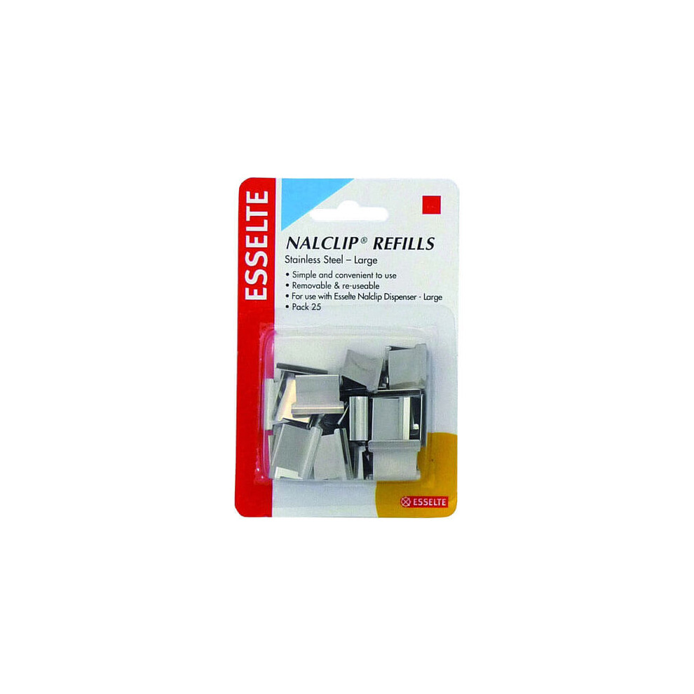 Esselte Stainless Steel Nalclip Refills (Large 25pk)33.62Buy!£OnBuy.comDelivery: in United Kingdom ReportThe nalclip system of fastening holds papers together without the need to punch holes in the paper. The dispenser easily attaches nalclip clips to...