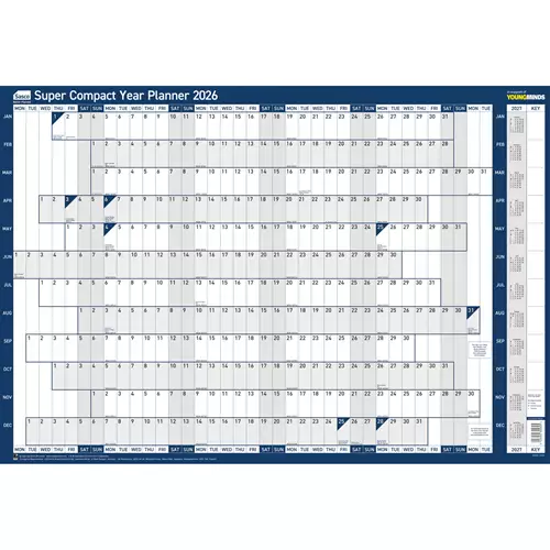 Sasco Super Compact Year Wall 400W x 285Hmm With Wet Wipe Pen & Sticker Pack Unmounted - 2410264 2410264 202617.26Buy!£Quzo.co.ukDelivery: to United Kingdom ReportSasco is the UKs number one brand in wall planners with over 50 years of expertise. With all the same features of the Sasco Original Year Wall Planner but in a super compact size ideal for home use or more→workspaces with limited display room. View all your events & activities from January to December at a glance. The landscape grid shows days running horizontally across the top while months are listed vertically down the side Day boxes are 21mm x 9mm in size. All UK & ROI bank holidays are clearly marked & weekends are shaded for easy reference. Also contains a quick reference calendar for the following year so you can plan even further ahead. The super compact planner is printed on high quality …