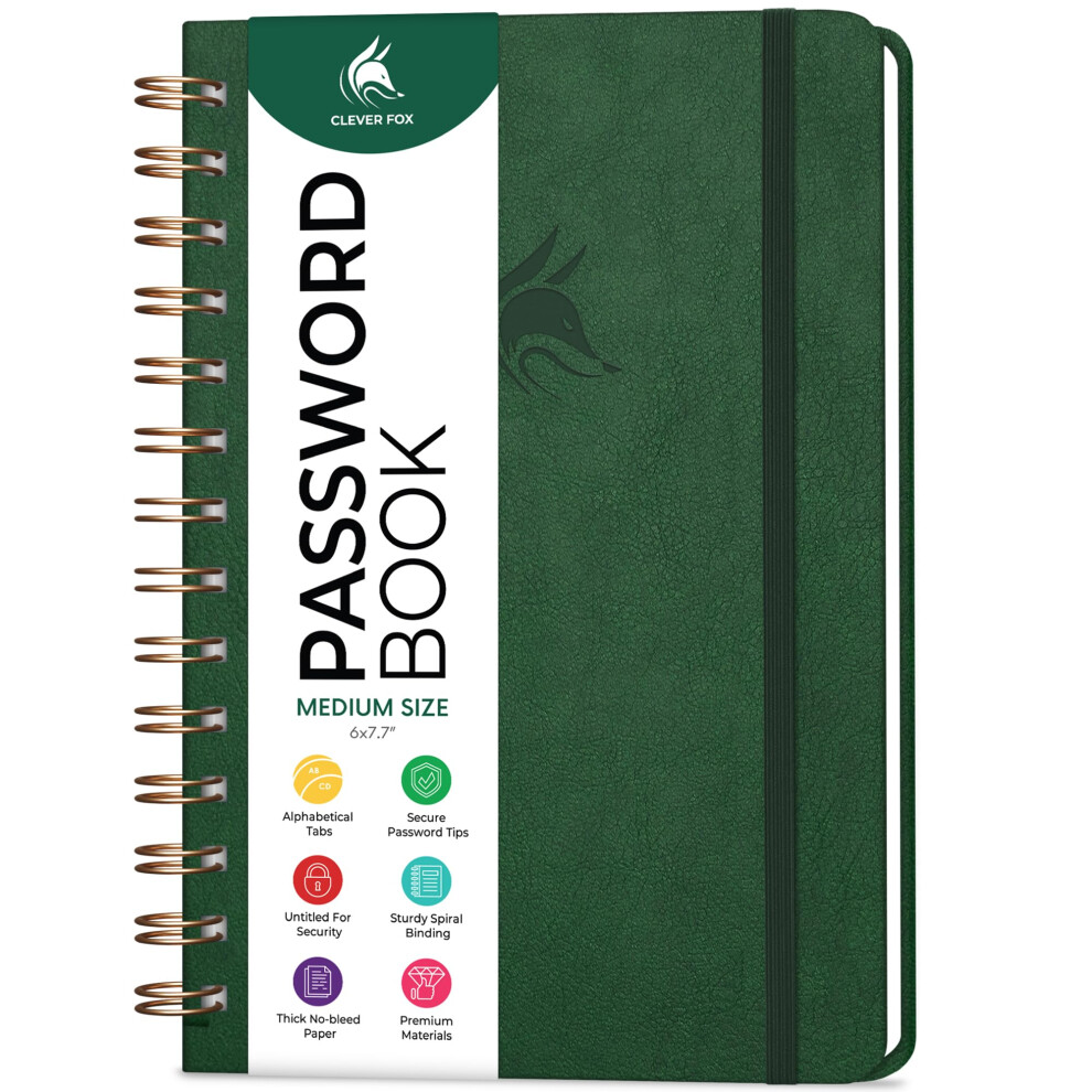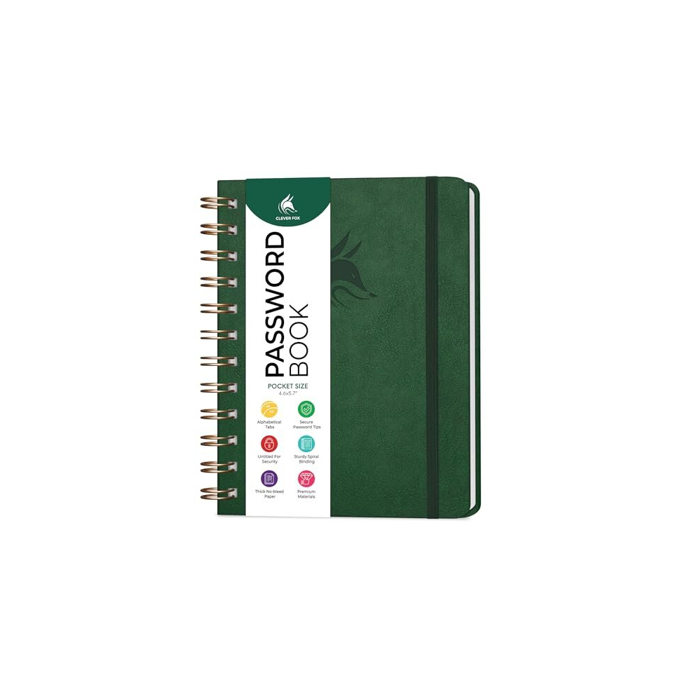 Clever Fox Password Book Spiral - Internet Address & Password Organize CFPB-Sfrom £31.77Compare prices2→CleverFoxPasswordBookSpiral-InternetAddress&PasswordOrganizerwithLaminatedAlphabeticalTabs-PasswordKeeperJournal-HardcoverMediumSize6.1x7.7