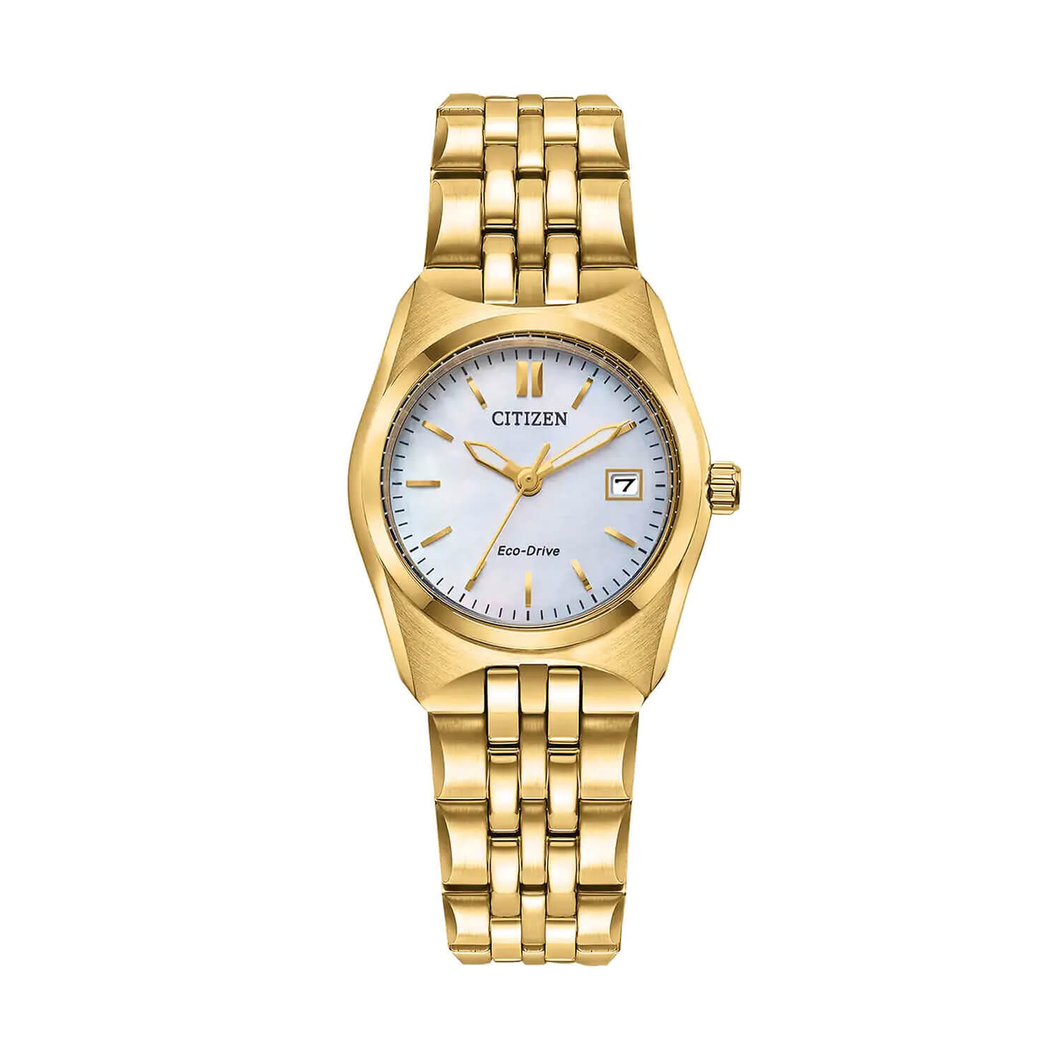 Corso Diamond 28mm Mother of Pearl Dial Gold Tone Steel Bracelet Ladies229.00Buy!£Fraserhart.co.ukDelivery: in United Kingdom ReportA classic timepiece is always in style. Discover this Ladies' Bracelet from Citizen, featuring a gold-tone stainless steel bracelet and case with a 3-hand Mother-of-Pearl dial and date indicator, lumi more→nous hands and gold-tone markers. This elegant timepiece also features a fold-over clasp closure with hidden push buttons and is water resistant to 100 metres. If you’re looking for a dress watch to add effortless style to your wardrobe, this is the perfect choice. It also uses Citizen’s proprietary Eco-Drive technology, so it is sustainably powered by any light and will never need a battery.