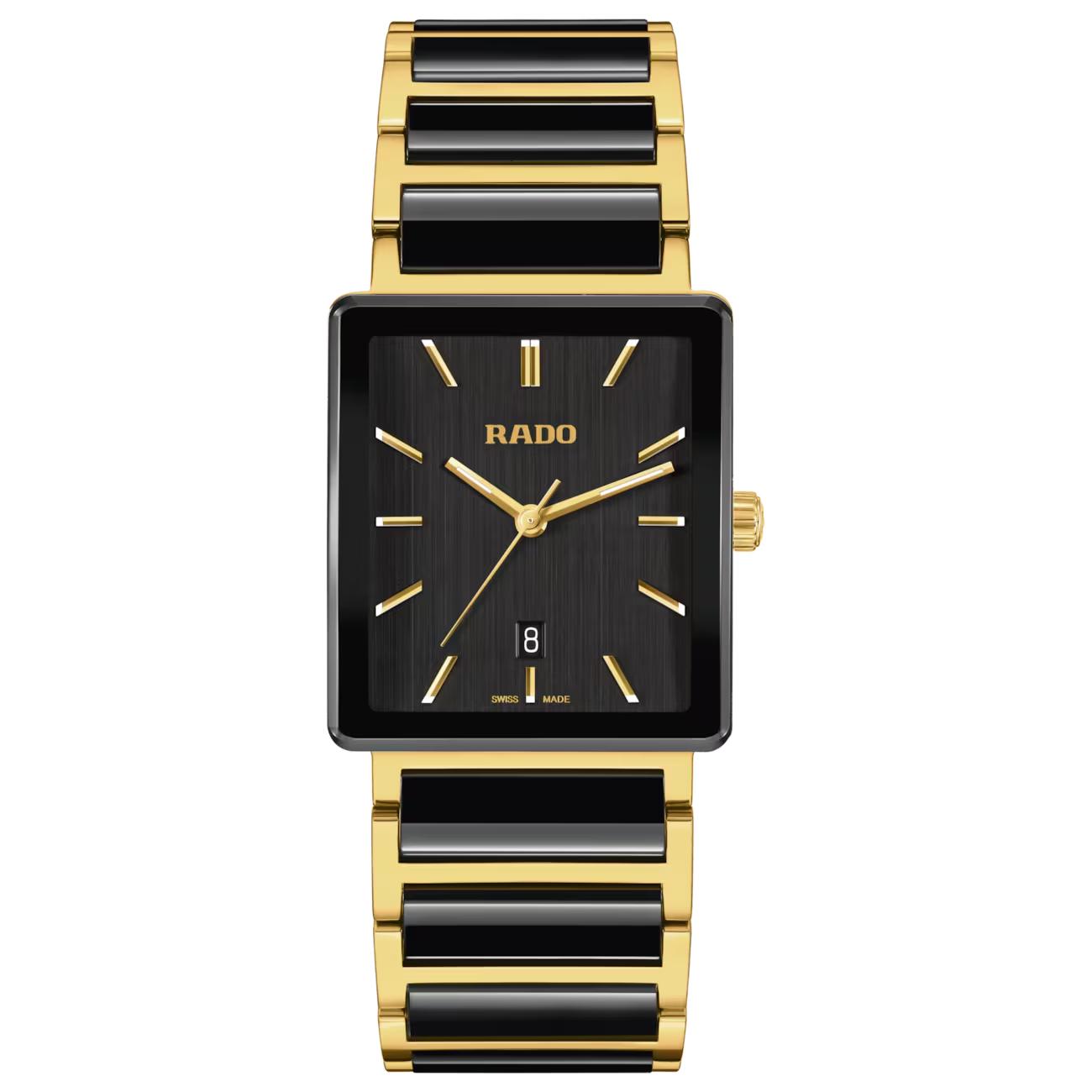 Integral 31.5mm Black Dial Two Tone Steel & Ceramic Bracelet2,100.00Buy!£Fraserhart.co.ukDelivery: in United Kingdom ReportA bold square silhouette and refined two-tone finish define this timepiece, blending modern design with enduring appeal. The 31.5mm stainless steel case is framed by a curved sapphire crystal with ant more→i-reflective coating, revealing a black vertically brushed dial accented by yellow gold-coloured indexes and hands with Super-LumiNova® for clear visibility. Powered by the precise Rado R218 quartz movement, it offers reliable performance beneath its sleek profile. The lightly tapered bracelet pairs stainless steel with polished yellow gold PVD and black high-tech ceramic links, ensuring comfort and durability. The Rado Integral delivers a confident expression of timeless style, crafted for