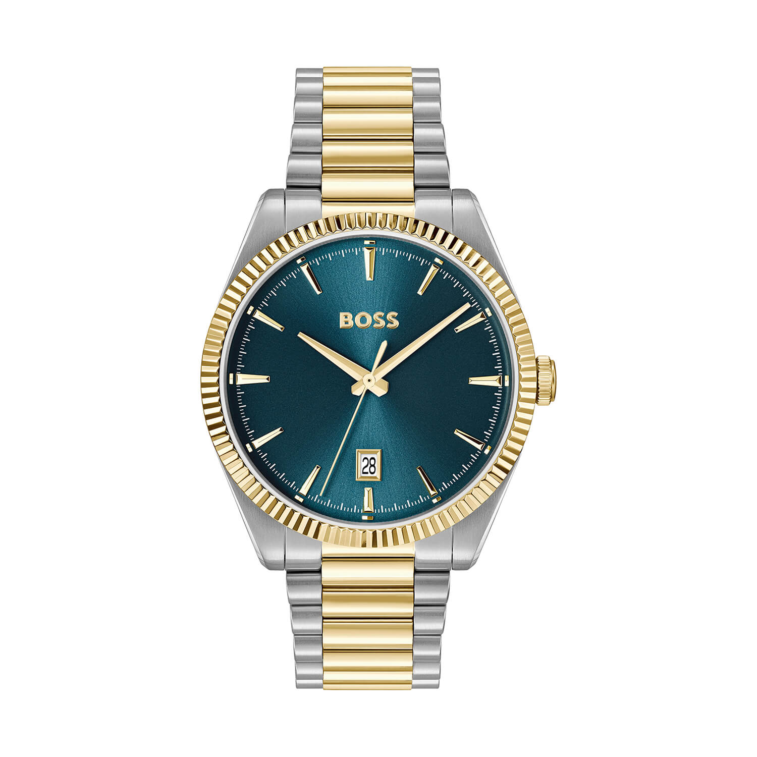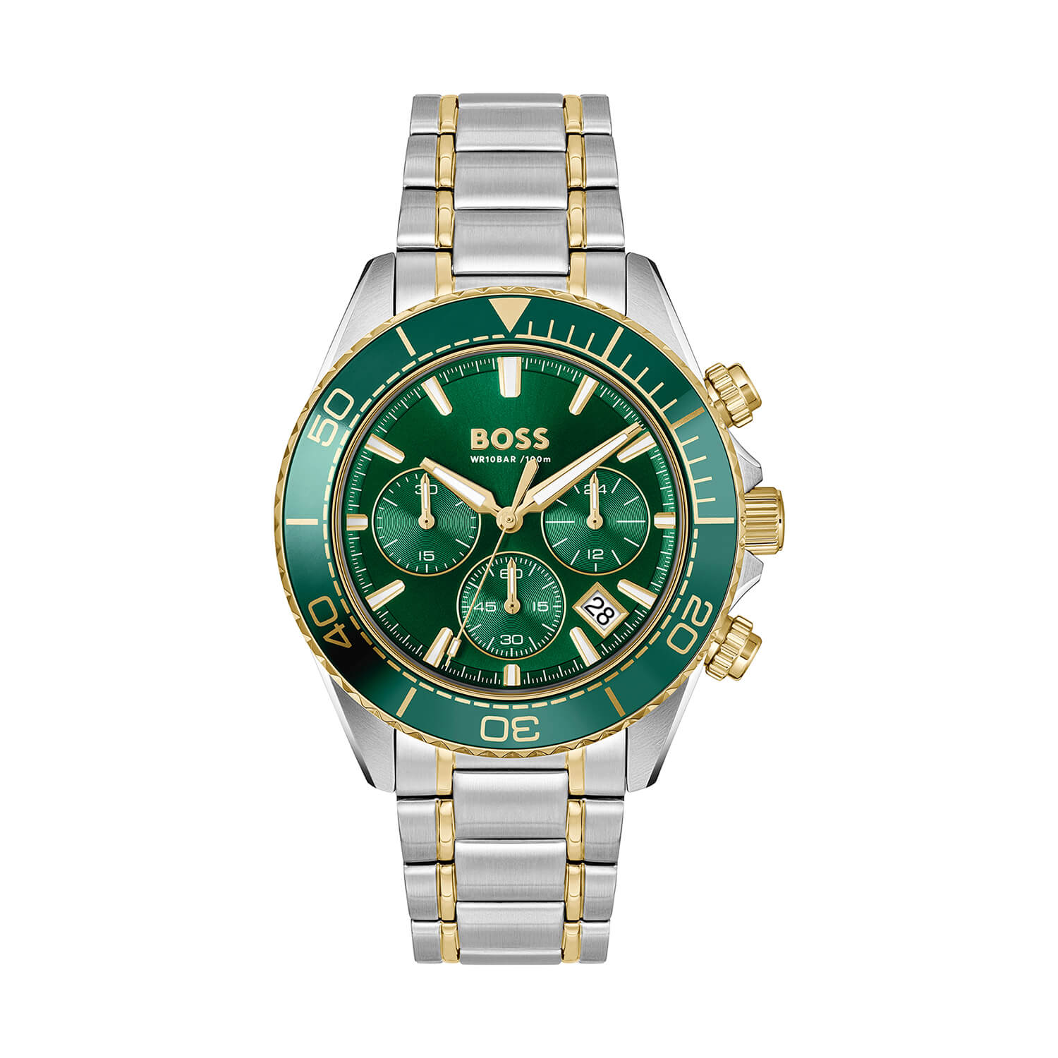 Sealiner 44mm Green Dial Two Tone Stainless Steel Bracelet Men's379.00Buy!£Fraserhart.co.ukDelivery: in United Kingdom ReportA striking green dial framed by a two-tone steel and yellow gold IP finish gives this 44mm chronograph its confident presence. Designed for precision, it features a reliable quartz movement with chron more→ograph and date functions, ensuring clear performance for everyday demands. The stainless steel case is complemented by an aluminium-accented bezel, while index markers provide clean readability beneath durable mineral glass. Water-resistant to 100 metres and secured with a push-button deployment clasp, the bracelet blends strength with refined contrast. This BOSS Sealiner delivers a bold yet balanced statement, built for those who value sharp design, dependable function, and a polished edge in