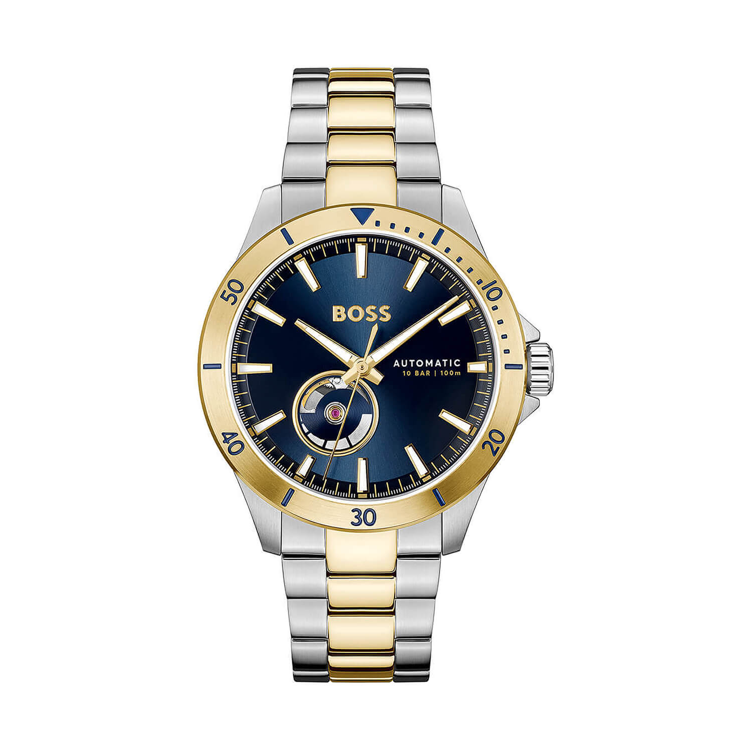 Troper Automatic 42mm Blue Open Heart Dial Two-Tone Steel Bracelet Men's329.00Buy!£Fraserhart.co.ukDelivery: in United Kingdom ReportThis BOSS model showcases a sophisticated dark blue dial with an open heart sub-dial between 6 and 8 o’clock, offering a glimpse of the automatic movement within. The dial is complemented by gold-tone more→baton indices and matching gold-tone hour, minute, and second hands. Framed by a gold-tone bezel and a polished gold-tone stainless steel case, the 42mm timepiece exudes elegance. The watch is completed with a two-tone stainless steel bracelet, secured with a deployment clasp for added style and comfort. Water-resistant up to 100 metres (10 bar), the watch’s automatic movement can be admired through its exhibition case back, making it both functional and visually captivating.